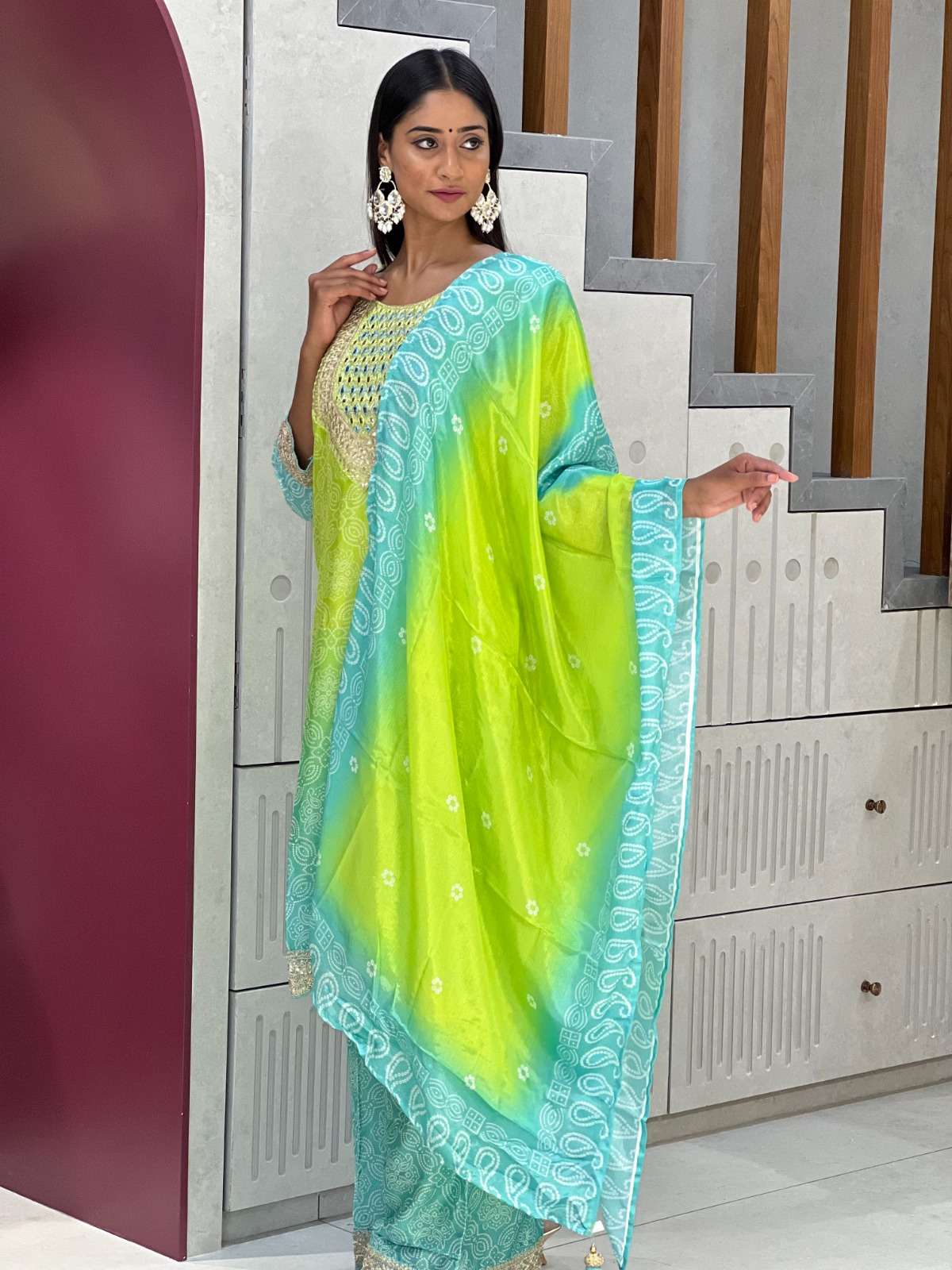 Chinon beautiful vibrant green and blue printed suit in wholesale surat