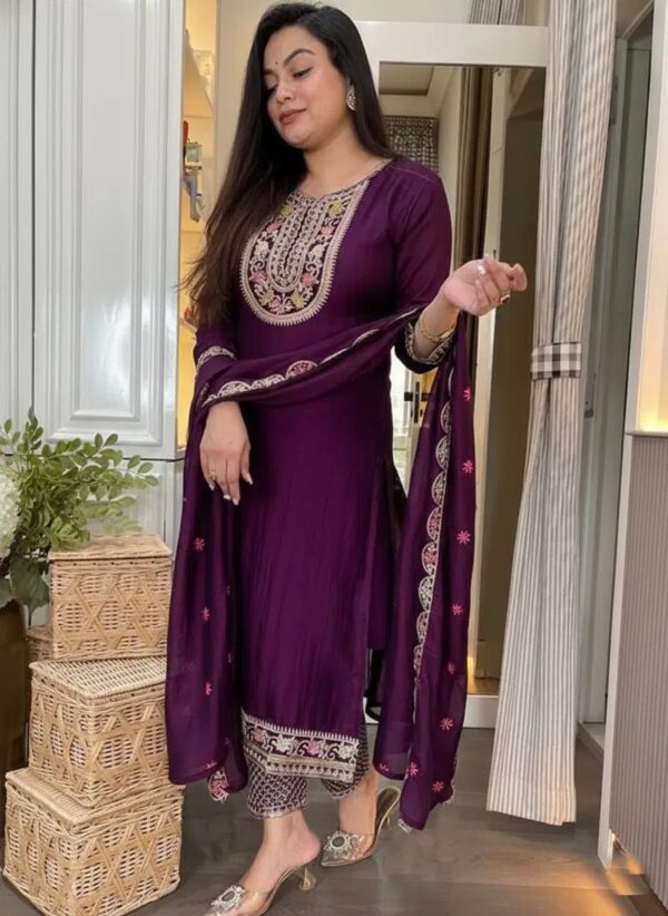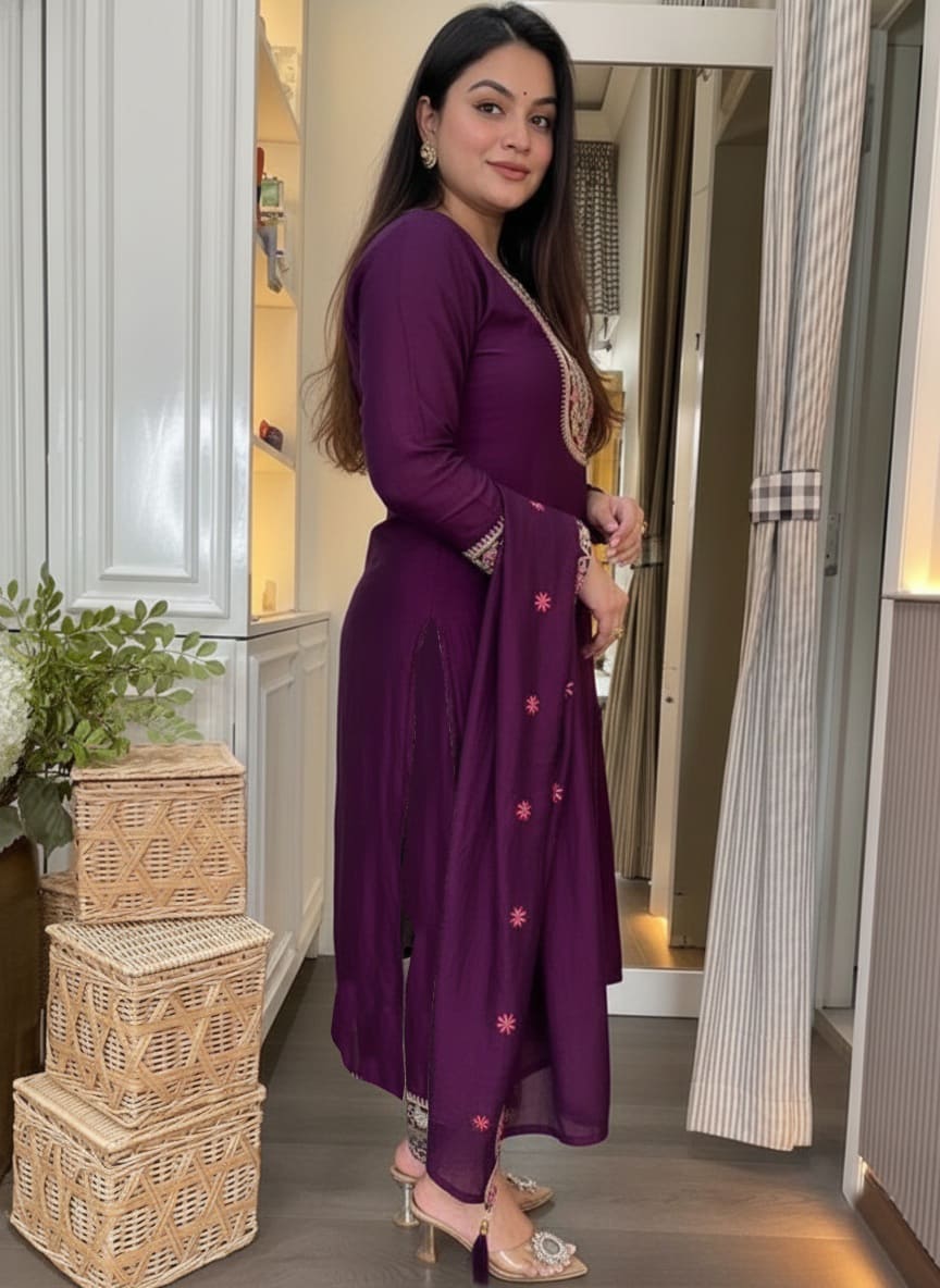 The designer kurta with matching pants and dupatta showcases rich cultural patterns and detailed prints that reflect timeless Indian fashion. Its breathable fabric ensures all-day comfort while the stylish silhouette gives you a trendy yet traditional appearance. Pair it with heels or ethnic footwear to create a perfect festive look.