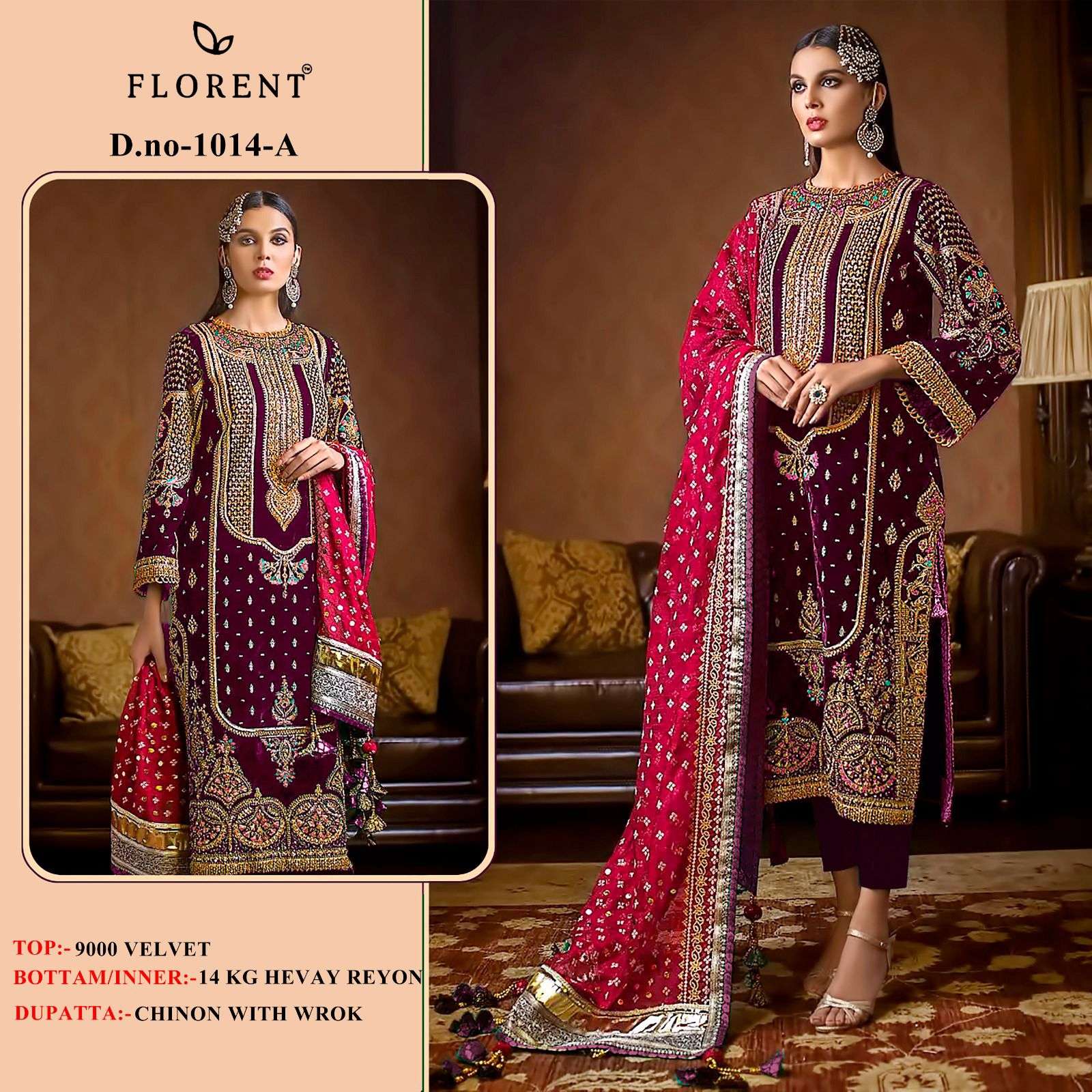 buy FLORENT™️ D NO- 1014 AB 9000 VELVET WITH HEAVY EMBROIDERY SUIT IN WHOLESALE SURAT latest catalogue 2025