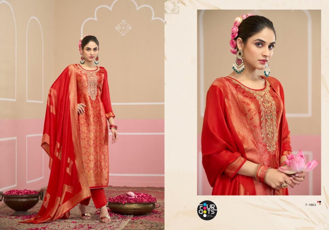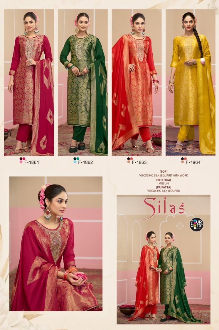 fourdots silas series 1861 to 1864 amazing viscose ho silk jacquard salwar kameez in wholesale surat Buy New Latest Catalogue 2025 fourdots silas series 1861 to 1864 amazing viscose ho silk jacquard salwar kameez in wholesale surat. Available in Singles and Bulk at Rehmat Boutique. Buy at Wholesale price at very reasonable rate. Specification :