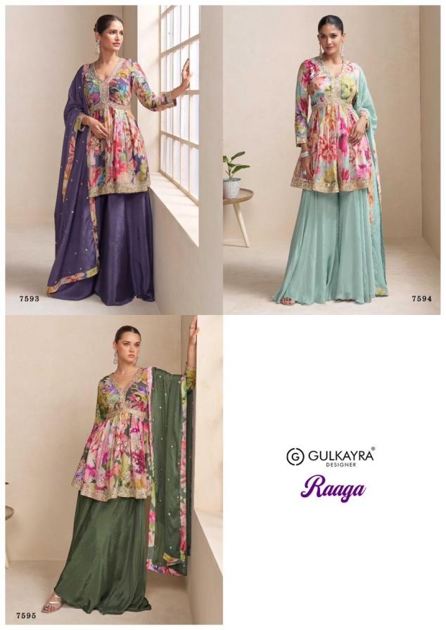 buy gulkayra designer raaga series 7593 to 7595 readymade unique chinon plazzo suit in wholesale surat latest catalogue 2025