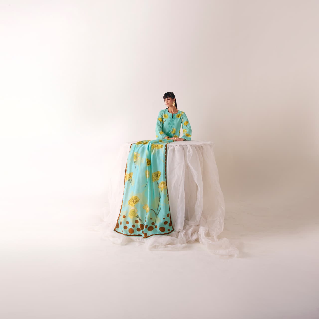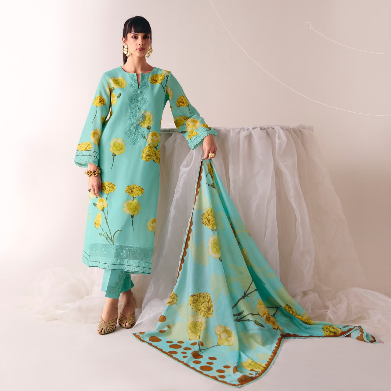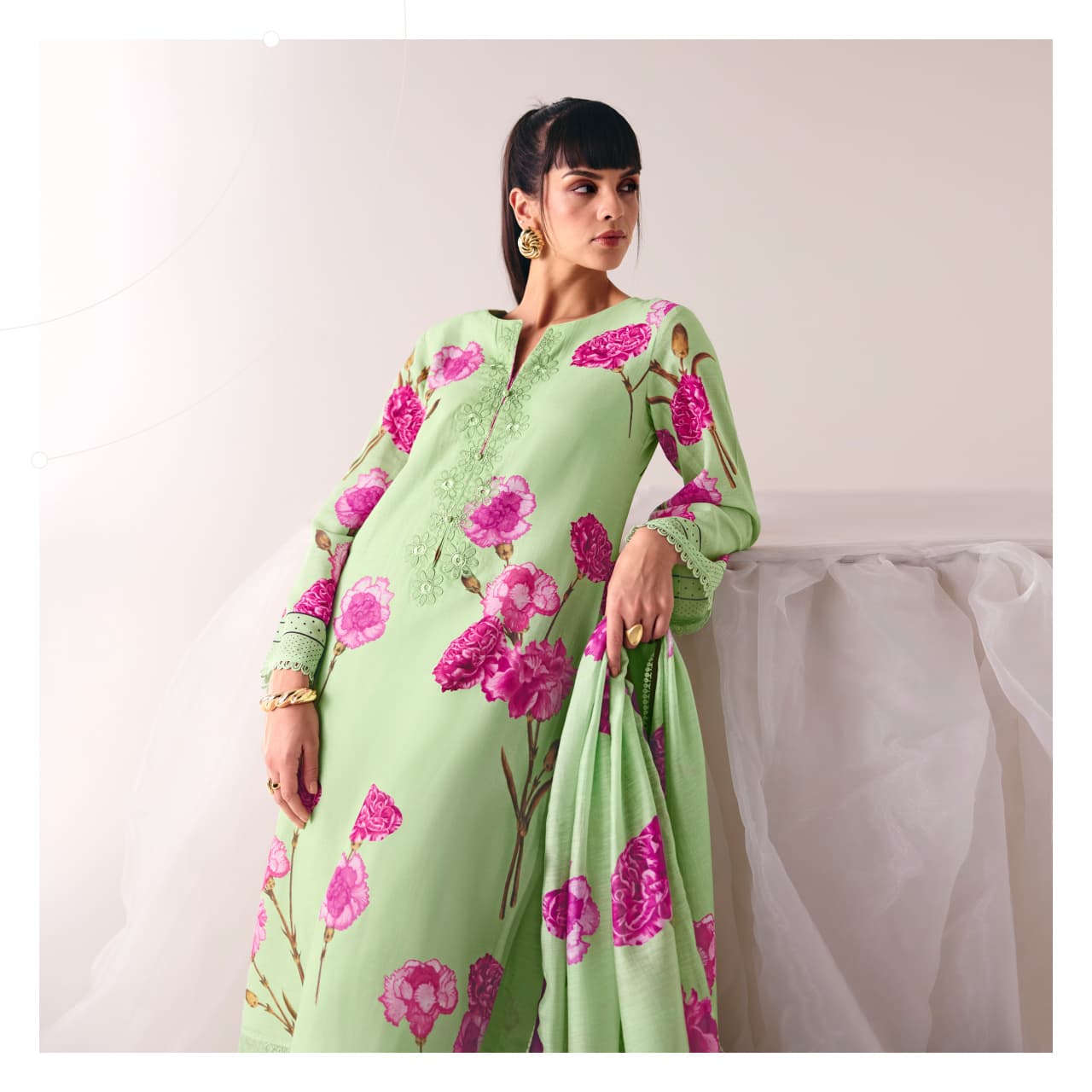 The designer kurta with matching pants and dupatta showcases rich cultural patterns and detailed prints that reflect timeless Indian fashion. Its breathable fabric ensures all-day comfort while the stylish silhouette gives you a trendy yet traditional appearance. Pair it with heels or ethnic footwear to create a perfect festive look.