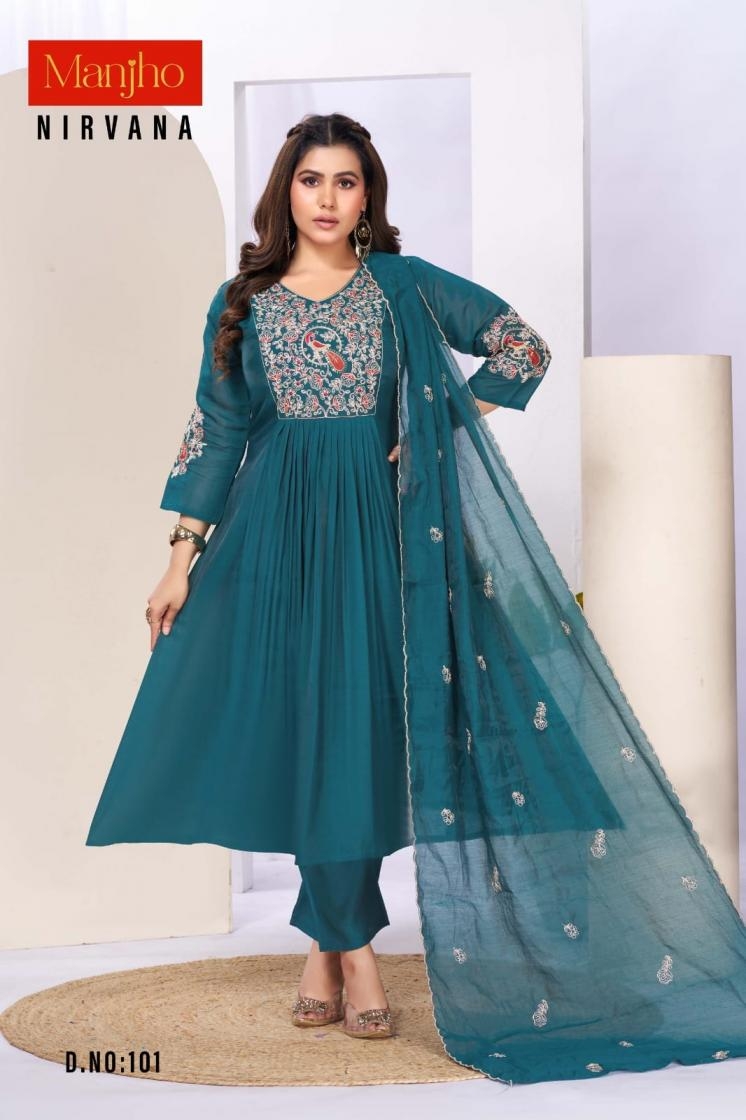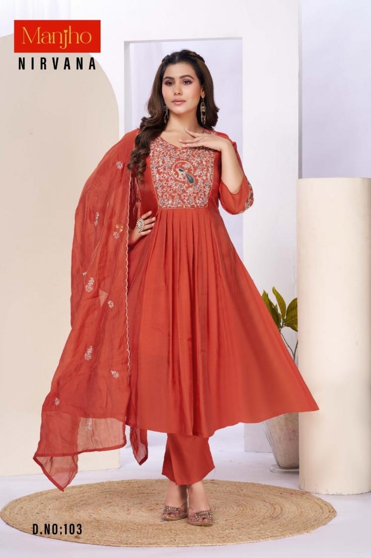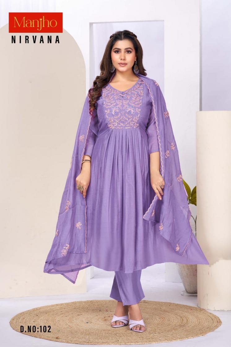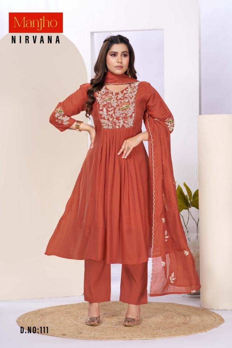buy manjho nirvana series 101-112 mul chanderi readymade suit latest catalogue 2025