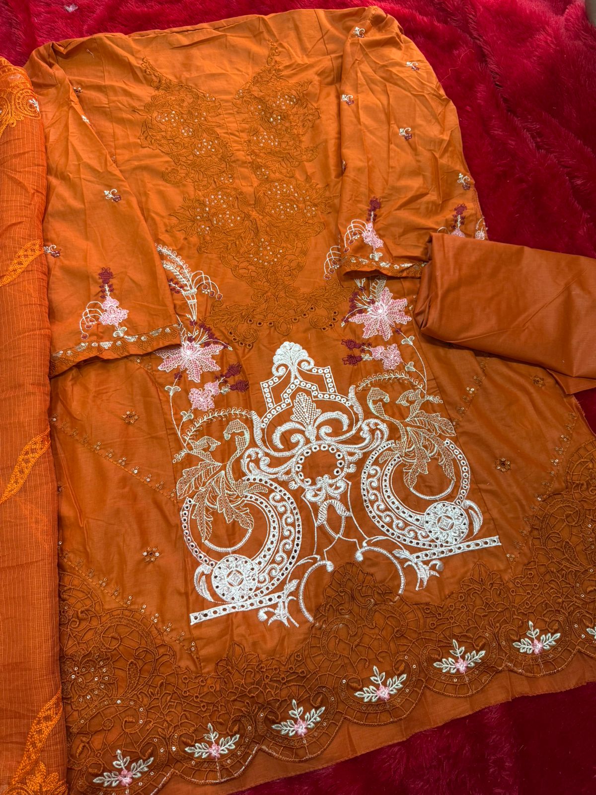 Top :- Pure Cotton With Self Embroidery Attached Embroidered Patches | Bottom :- Cotton Solid | Dupatta :- Kota Heavy Embroidery | [Pakistani Copy]