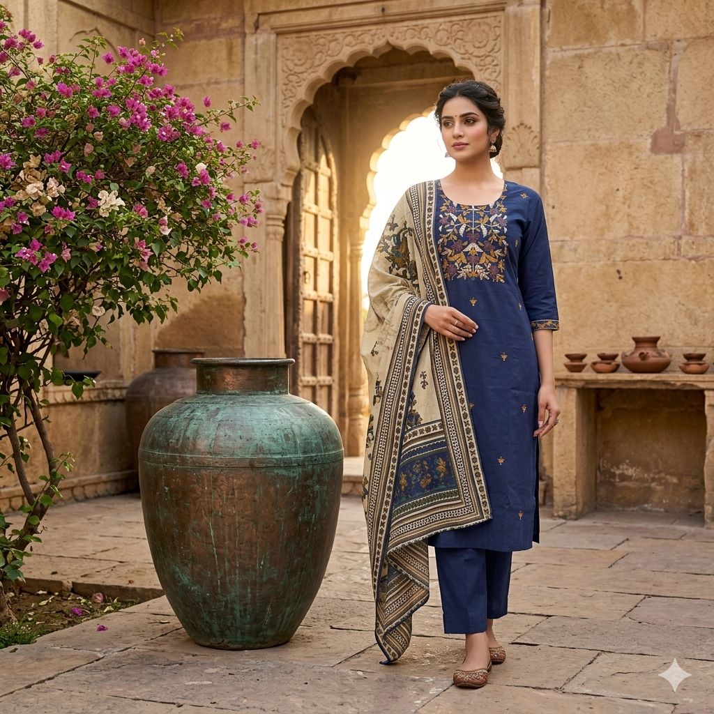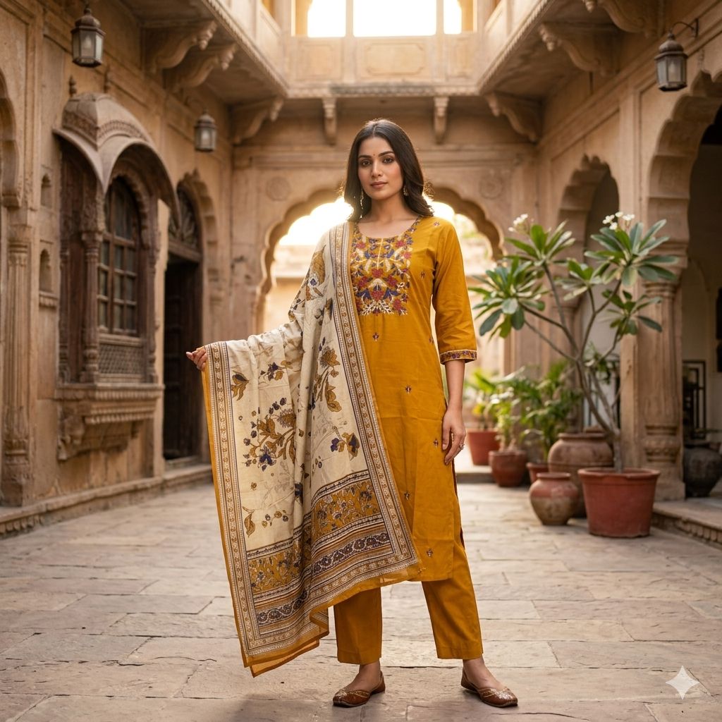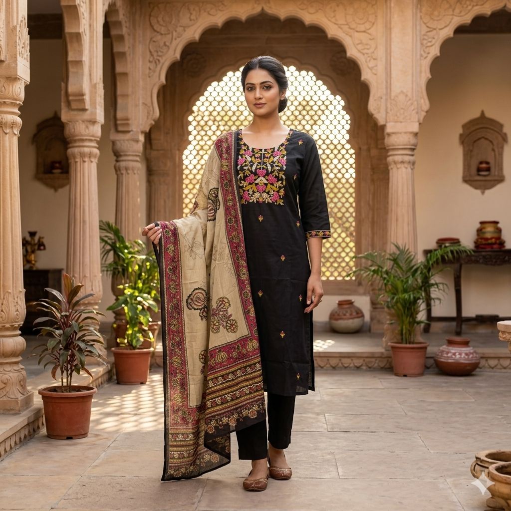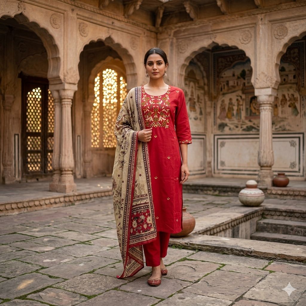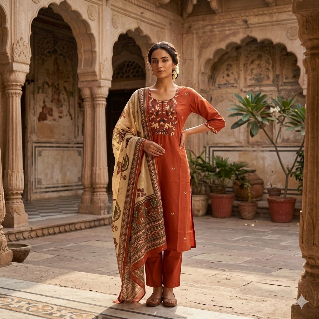 The designer kurta with matching pants and dupatta showcases rich cultural patterns and detailed prints that reflect timeless Indian fashion. Its breathable fabric ensures all-day comfort while the stylish silhouette gives you a trendy yet traditional appearance. Pair it with heels or ethnic footwear to create a perfect festive look.