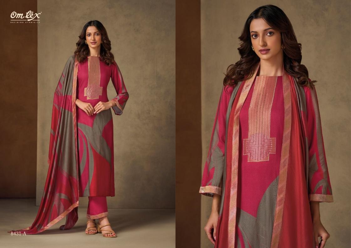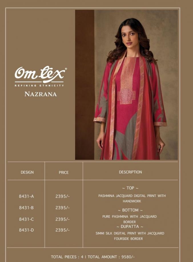 omtex launch nazrana series 8431 A to 8431 D unique pashmina jacquard salwar kameez in wholesale surat Buy New Latest Catalogue 2025 omtex launch nazrana series 8431 A to 8431 D unique pashmina jacquard salwar kameez in wholesale surat. Available in Singles and Bulk at Rehmat Boutique. Buy at Wholesale price at very reasonable rate. Specification :