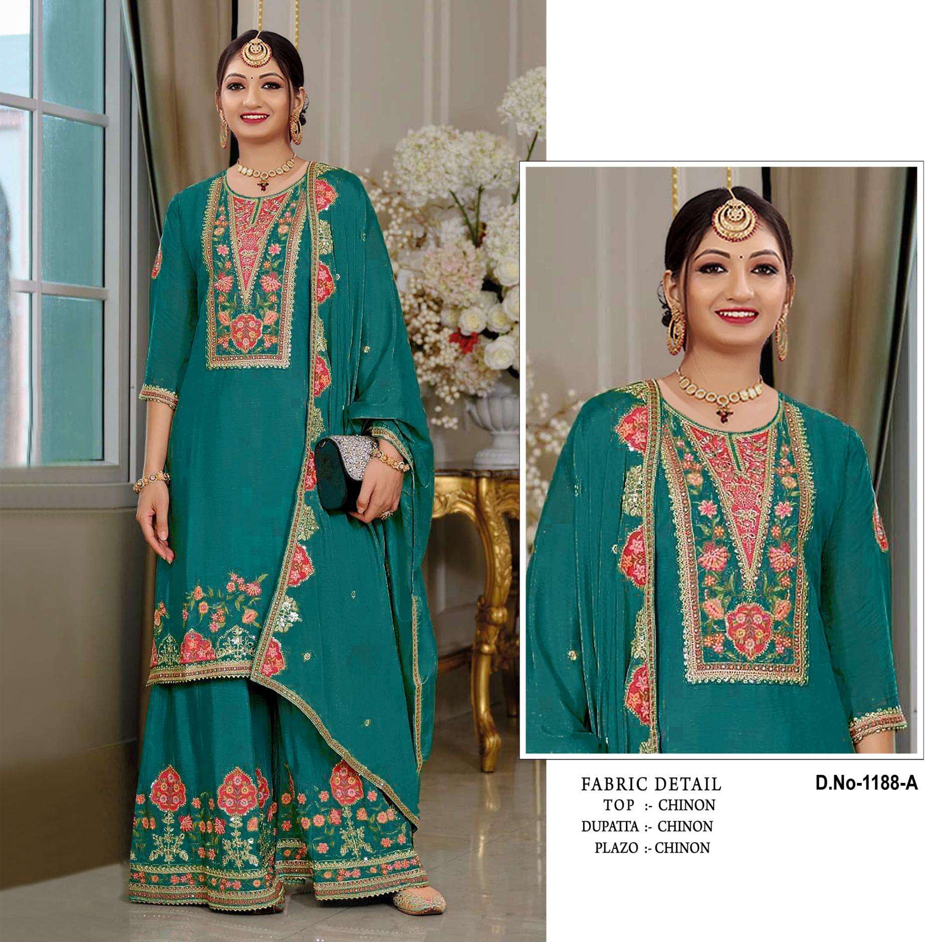buy PR 9STAR FASHION CHAHAT series 1188 A to 1188 C SEMI STITCHED HEAVY CHINON WITH EMBRODEIRY WORK AND SEQUENCE WORK FANCY DESIGNER SUITS IN WHOLSALE SURAT latest catalogue 2025