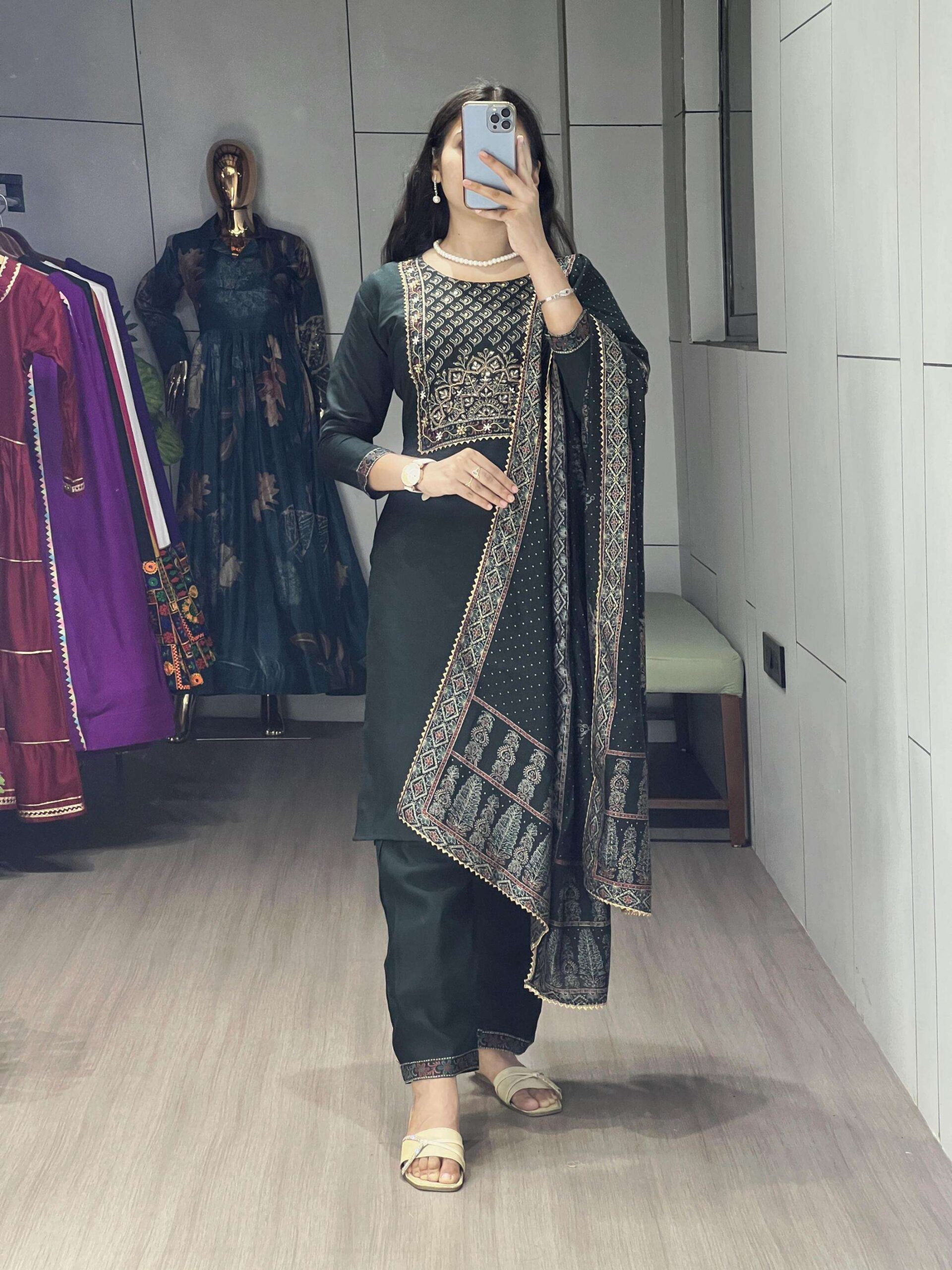 Pure Modal Chanderi Kurti Pair with Foil Print and HandWork👜 A perfect pick for special occasions, this 3-piece set having foil prints, With Hand Work Comes complete with a matching dupatta and comfy bottom wear.✨👜👌🏻 GRTN8114DRKZGRN