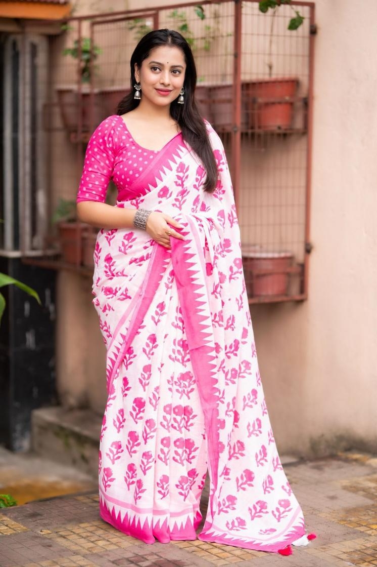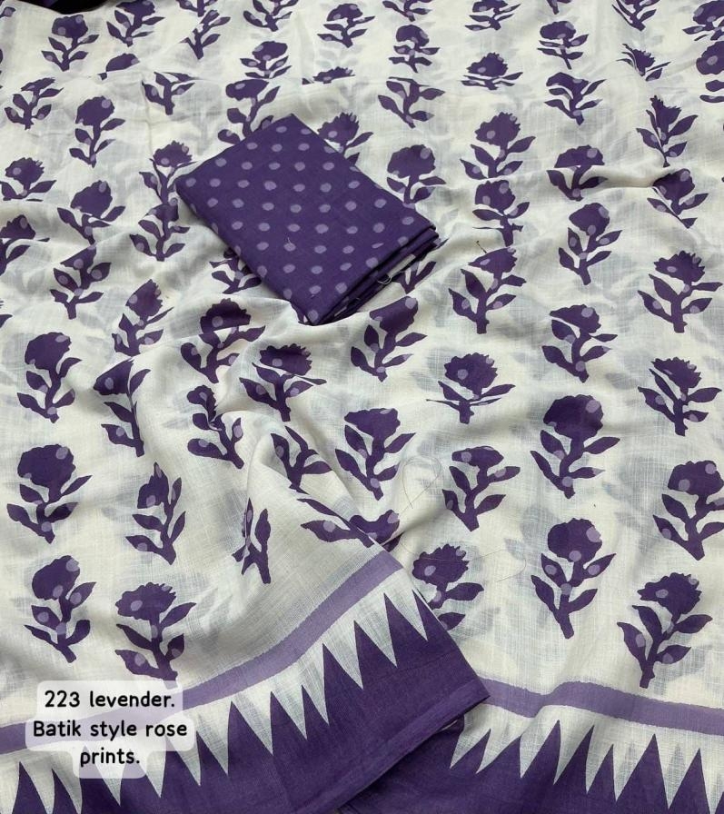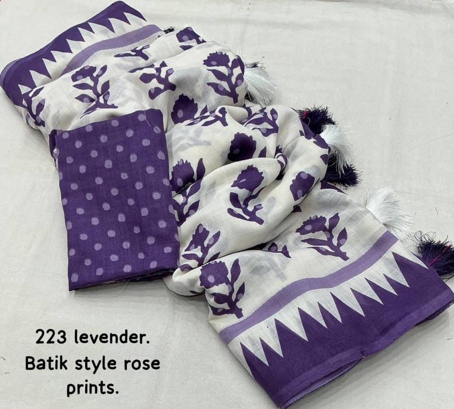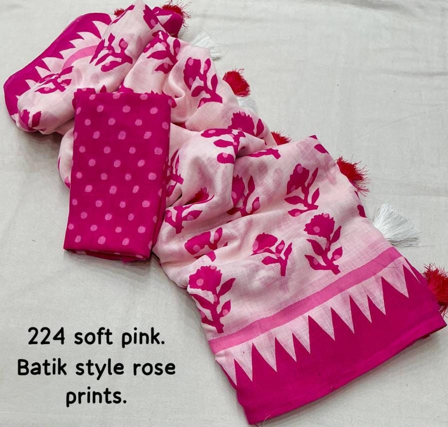 TRENDING new linen printed catalog Quality- soft linen saree with batik style rose prints. Cotton tassles on pallu. Blouse- running linen butti prints. Rate – 570+ship. Top truated quality. |