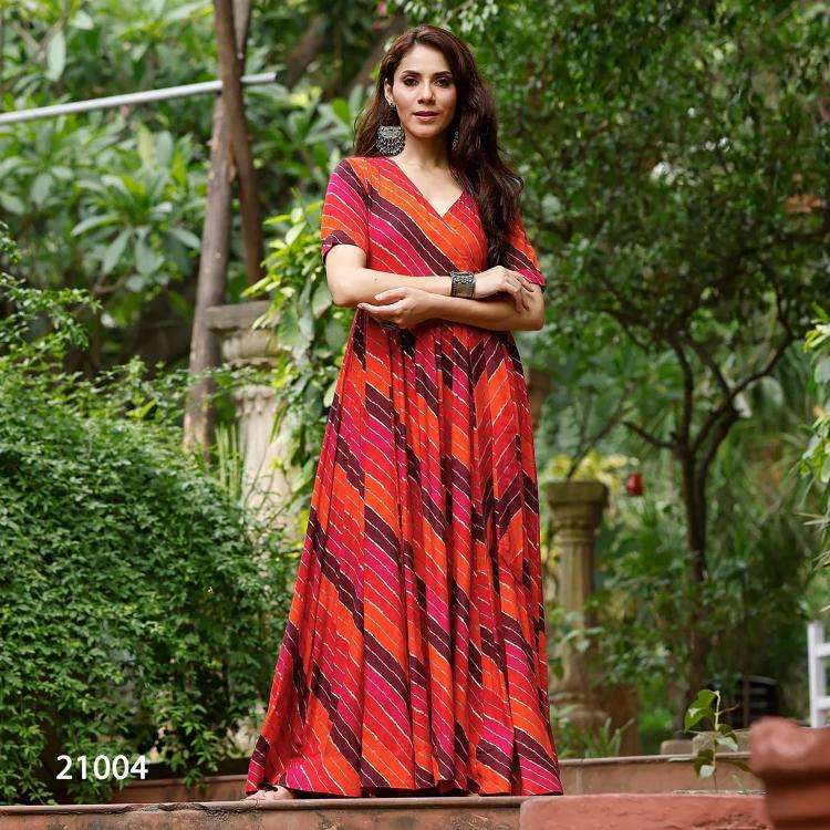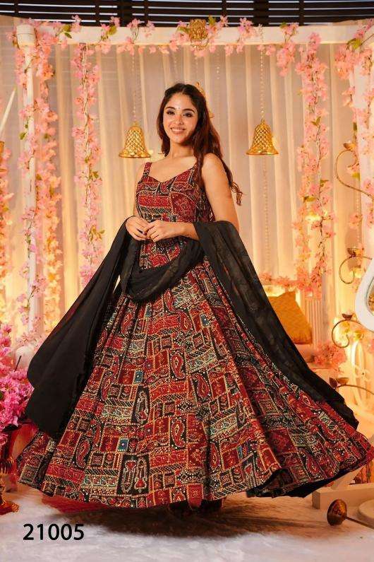 Lucaya Vol 21 (Ethnic wear) this stunning Beautiful digital printed Ethnic wear gown set collection (set of 7 beautiful design 21001 to 21007) Brand name :- PR Catalog name :- Lucaya vol 21 Product details Design no -21001 & 21002 Fabric: Heavy air Tex chinon Work:- Heavy Digital Printed Inner details:- full inner Design no -21003 to 21007 Fabric: Heavy Rayon Work:- Heavy Digital Printed Inner details:- Half inner length: – up to 56 inch” Flair:- 3.5 mtr Stitched type :- Full stitched Dupatta fabric:- Dupatta length :- 2.5mtr approx. Note:- sleeves fabric attached with sleeveless design (design no -21001&21005) Size: – XS(34),S(36),M(38),L(40),XL(42),XXL(44), 3XL(46), 4XL(48), 5XL(50), 6xl(52) (all size available) Occasion:- Festival Wear, Function, Ceremonial, Wedding Wear, Party Wear Note: – 10-12% Colour variations may occur due to different screen resolutions RATE: – 1149/- For all size GST : 5% |
