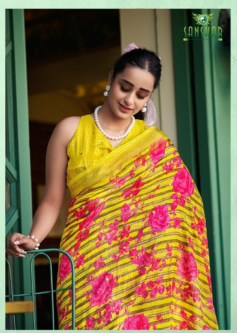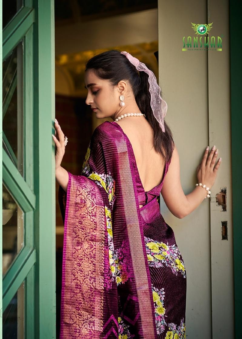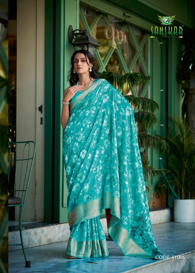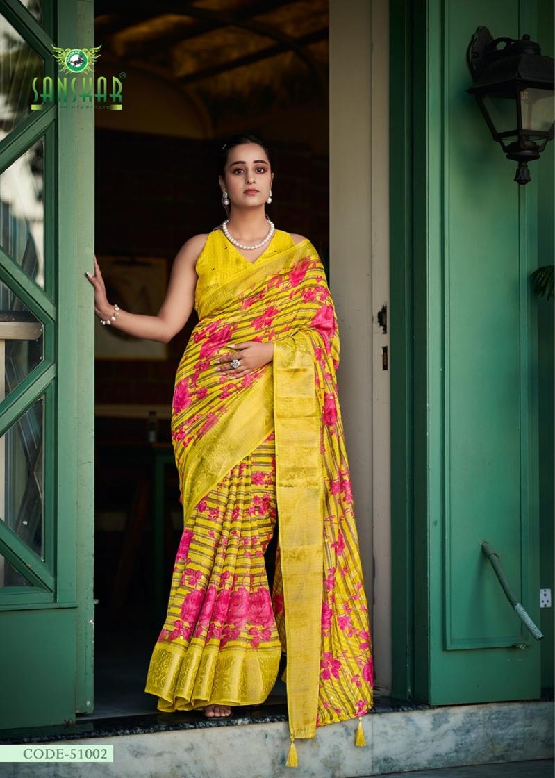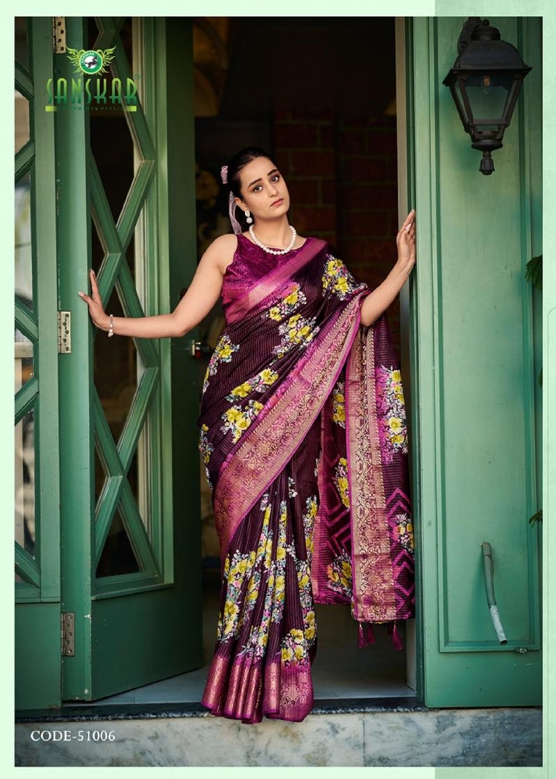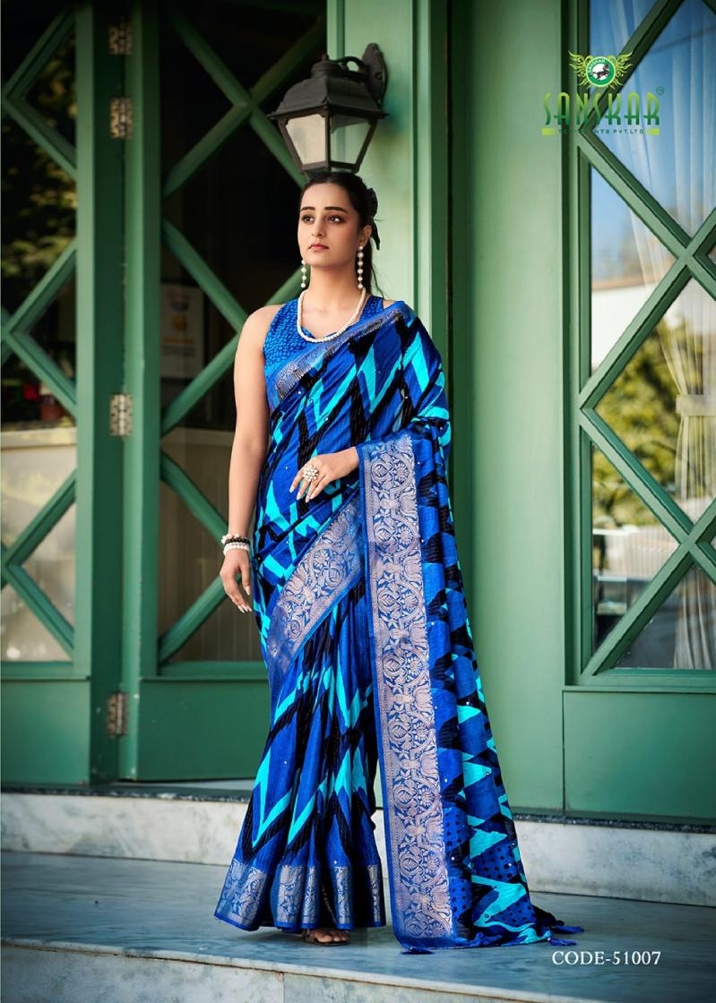 | Name : | Sanskar Tex Aanu Series 51001 To 51008 Prints Hit Design Dola Jari Lining Sarees In Wholesale Surat | |
