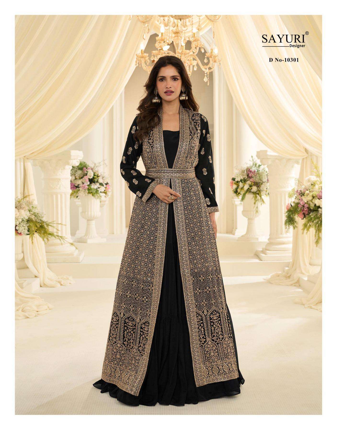 buy sayuri designer mastani series 10300-10302 real chinon silk gown with jacket latest catalogue 2025