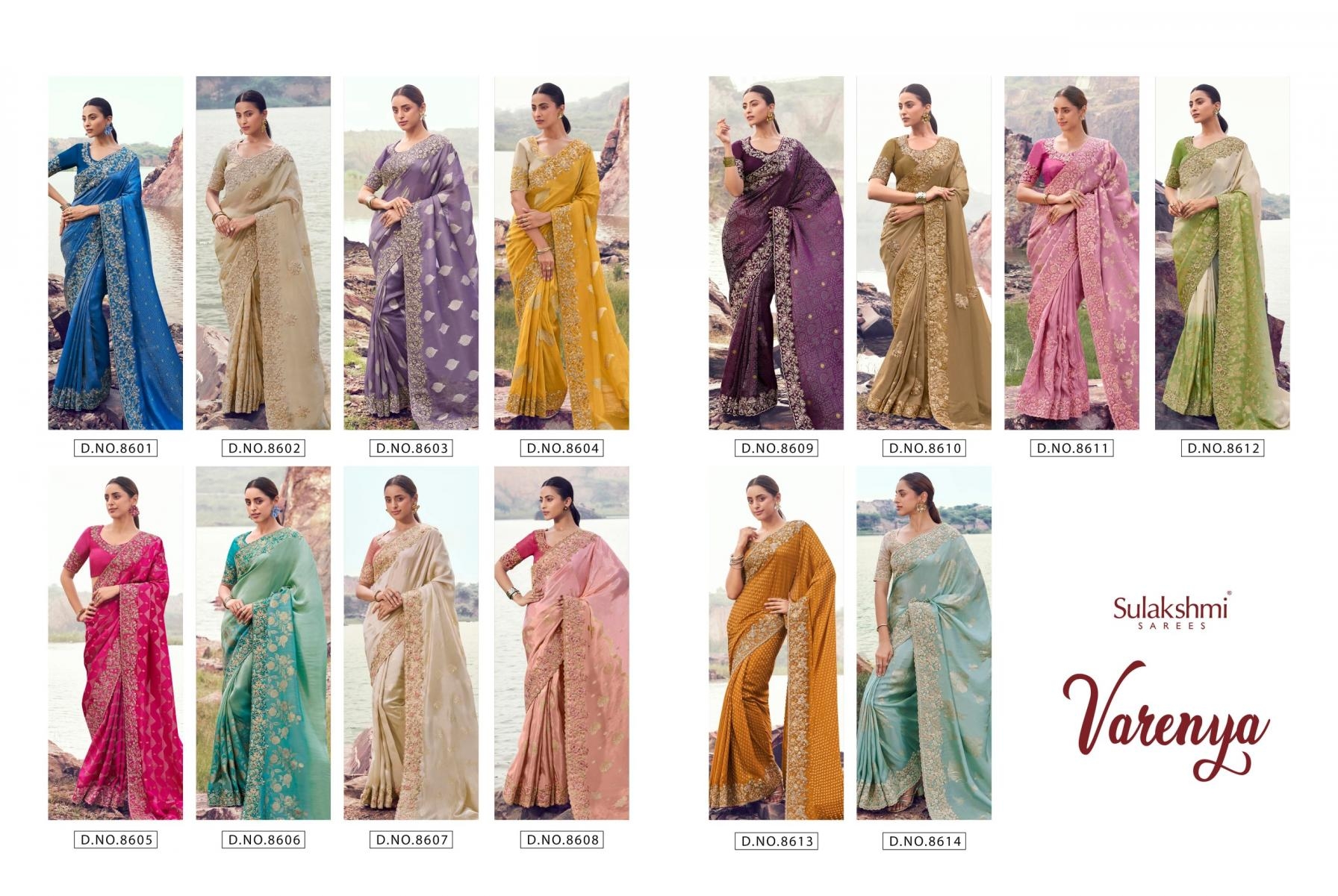 sulakshmi varenya series 8601 To 8614 tissue silk with jacquard occasion wear sarees in wholesale surat Buy New Latest Catalogue 2025 sulakshmi varenya series 8601 To 8614 tissue silk with jacquard occasion wear sarees in wholesale surat. Available in Singles and Bulk at Rehmat Boutique. Buy at Wholesale price at very reasonable rate. Specification :