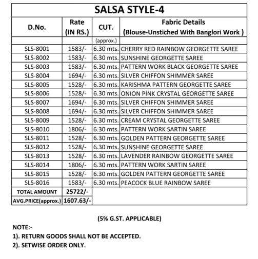 | Name : | Tfh Salsa Style Vol 4 Series 8001-8016 Fancy Wholesale Saree In Surat | |