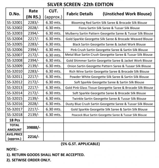 | Name : | Tfh Silver Screen Vol 22 Series 32001 To 32018 Sartin Georgette Traditional Sarees In Wholesale Surat | |