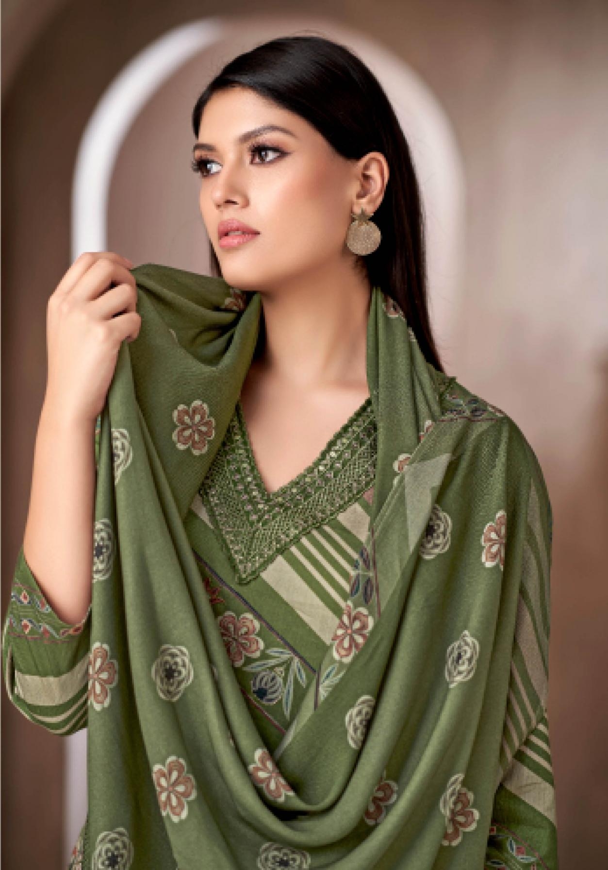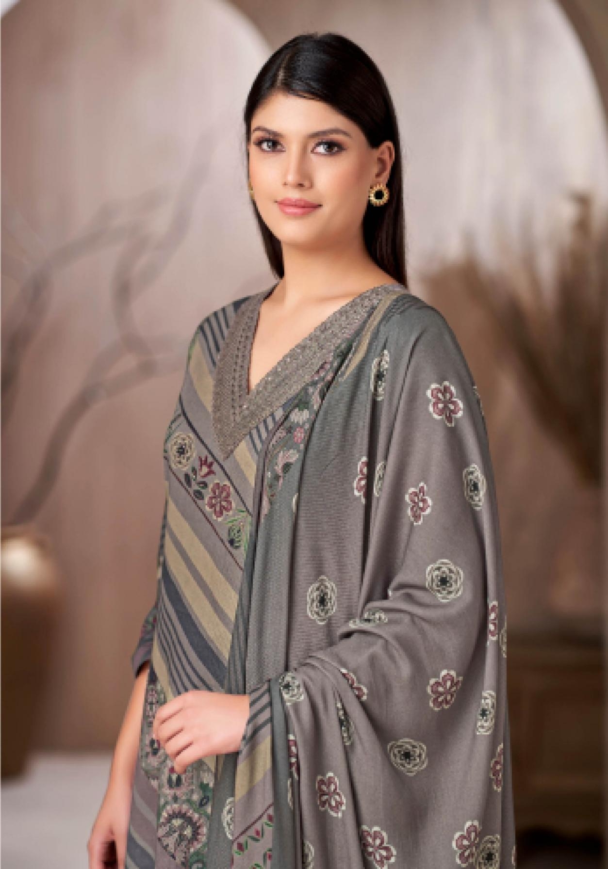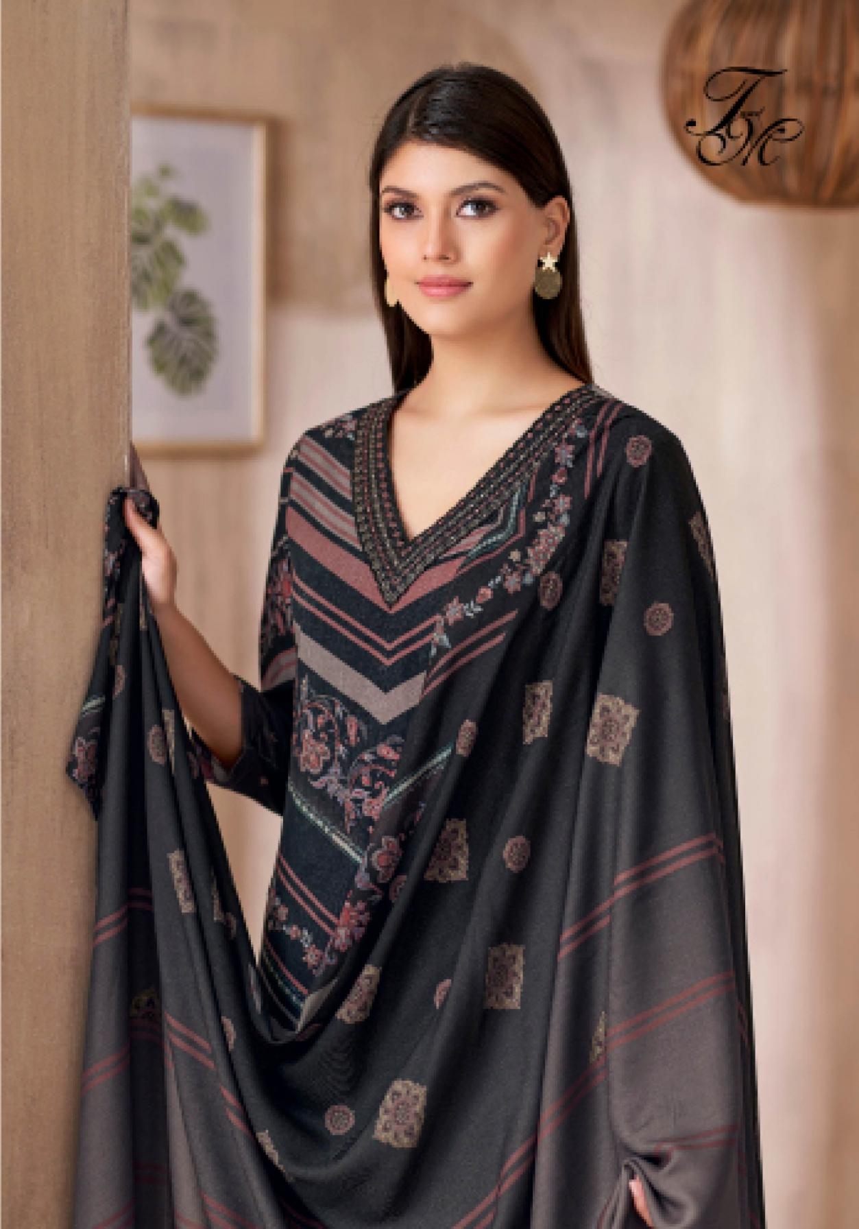 T&M TOP – PURE CORDUROY RICH DIGITAL PRINT ENHANCED WITH HAND WORK AND FANCY EMB. DAMAN AND AN ELEGANT EMB. NECK PLACKET BOTTOM – PURE HEAVY PASHMINA SOLID DYED PAIRED WITH A STYLISH DIGITAL PRINTED PLAZZO DUPATTA – PURE SHAWL DIGITAL PRINTED RATE: 1895/- + Gst |