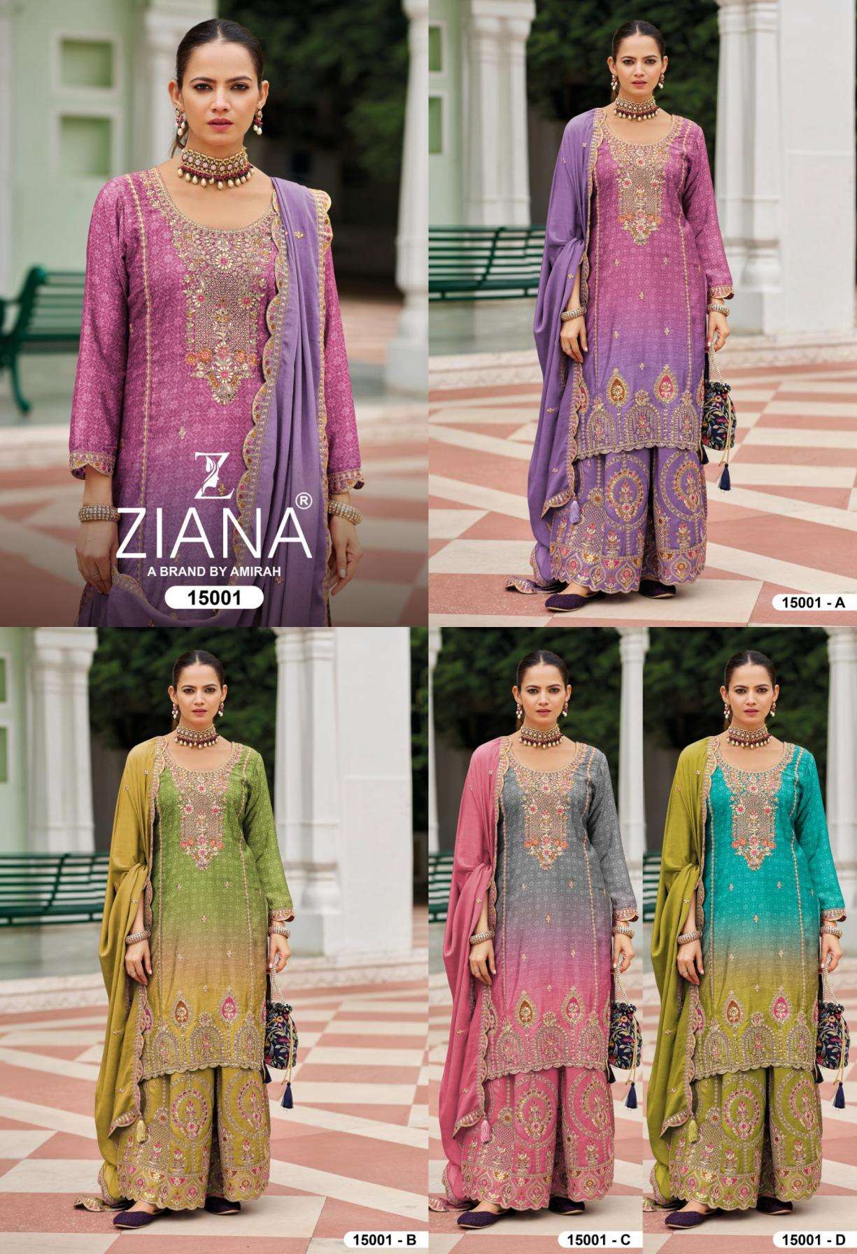buy ziana 15001 A to D chinon silk readymade party wear sharara style suit in wholesale surat latest catalogue 2025