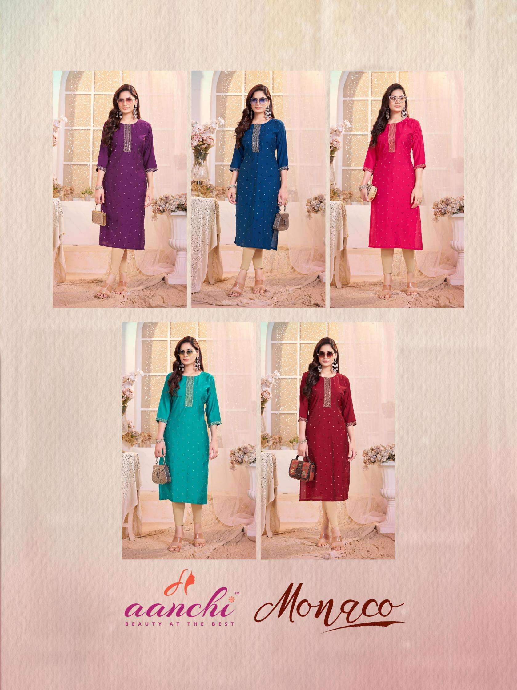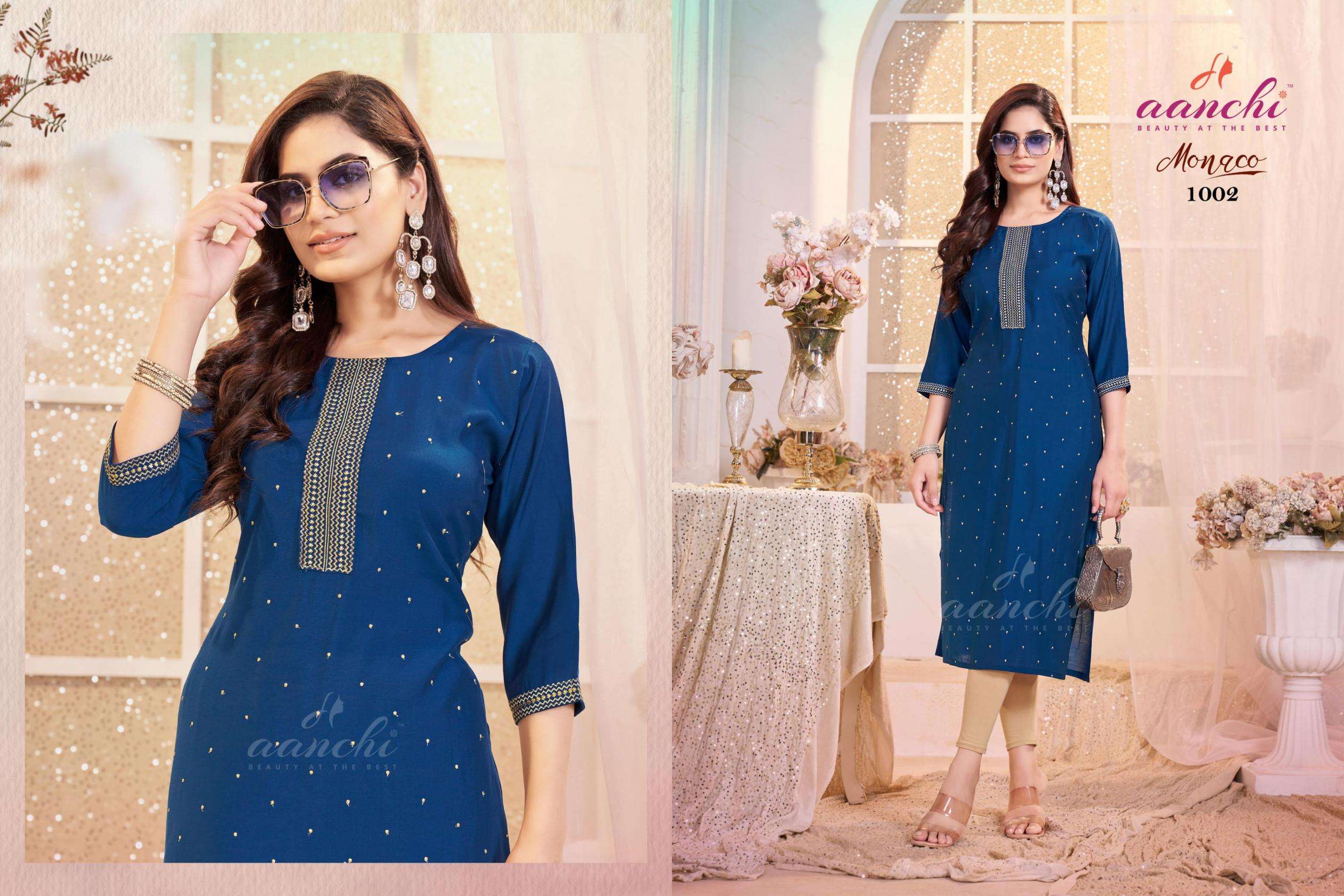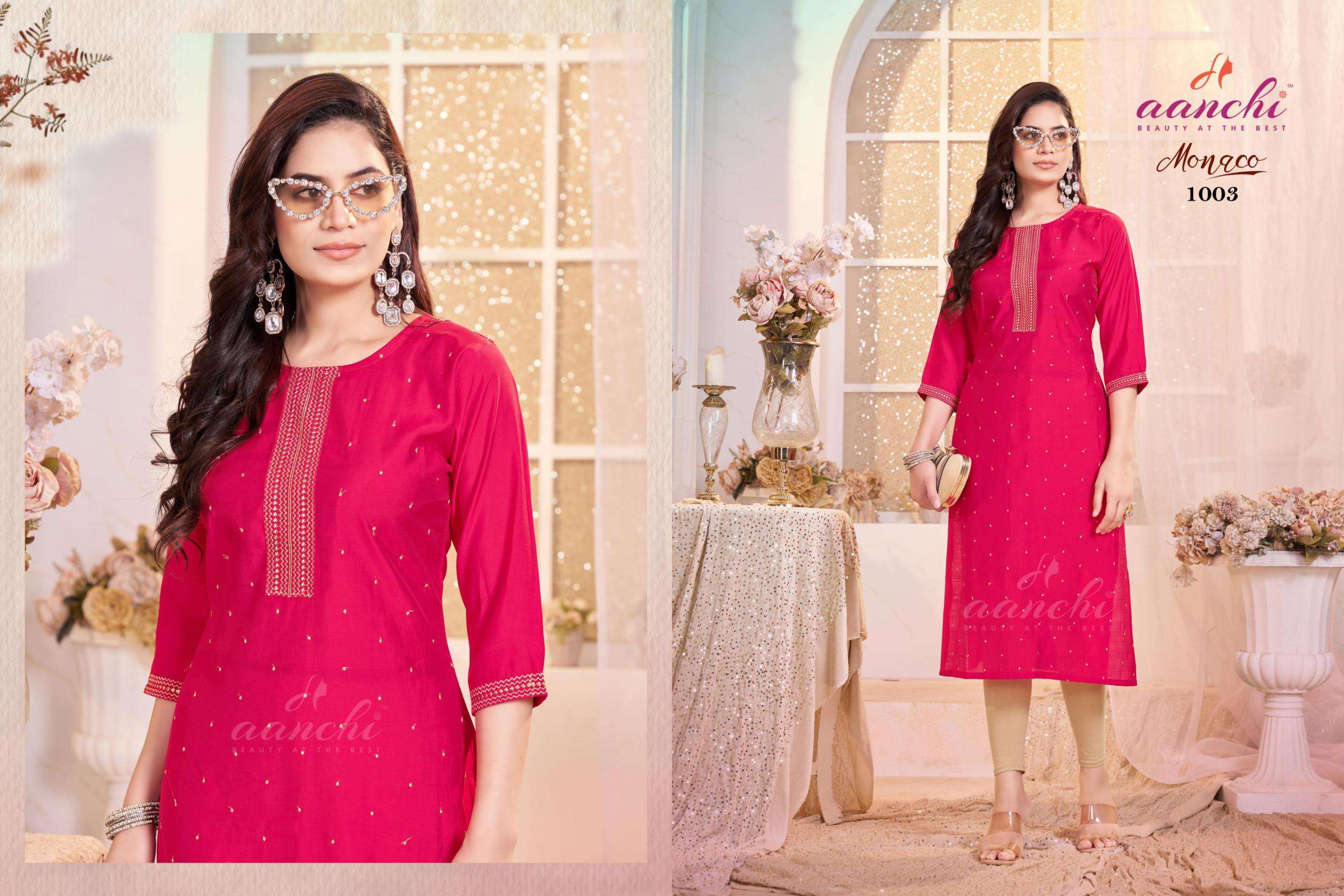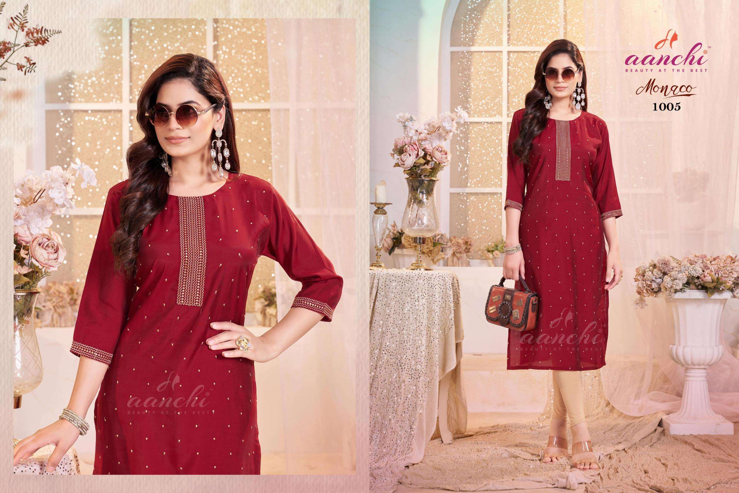 buy aanchi monaco series 1001 to 1005 roman silk readymade pretty look long kurti in wholesale surat latest catalogue 2025