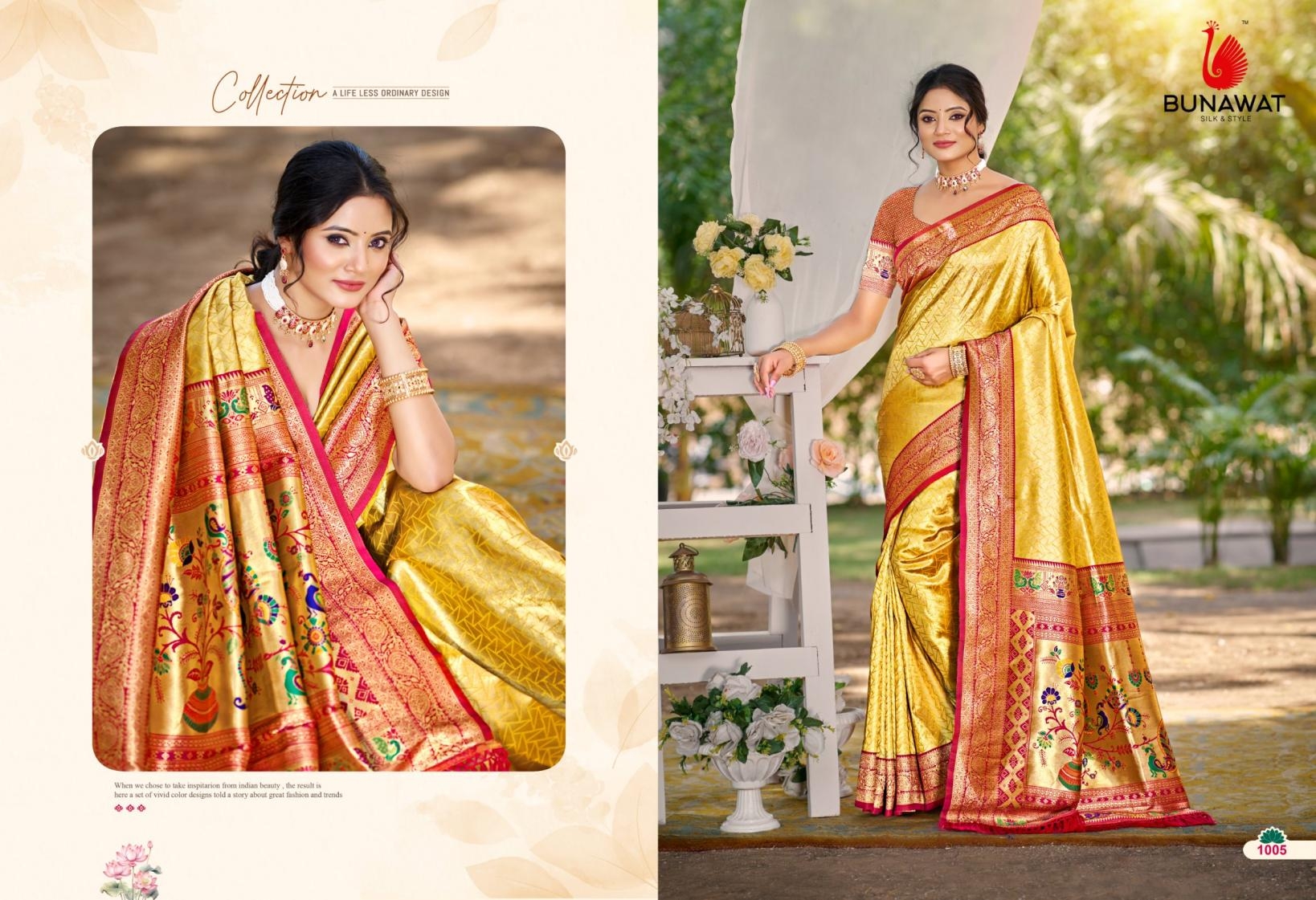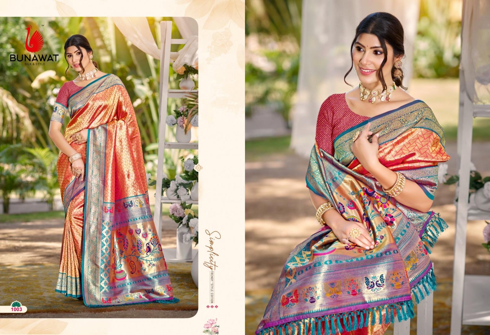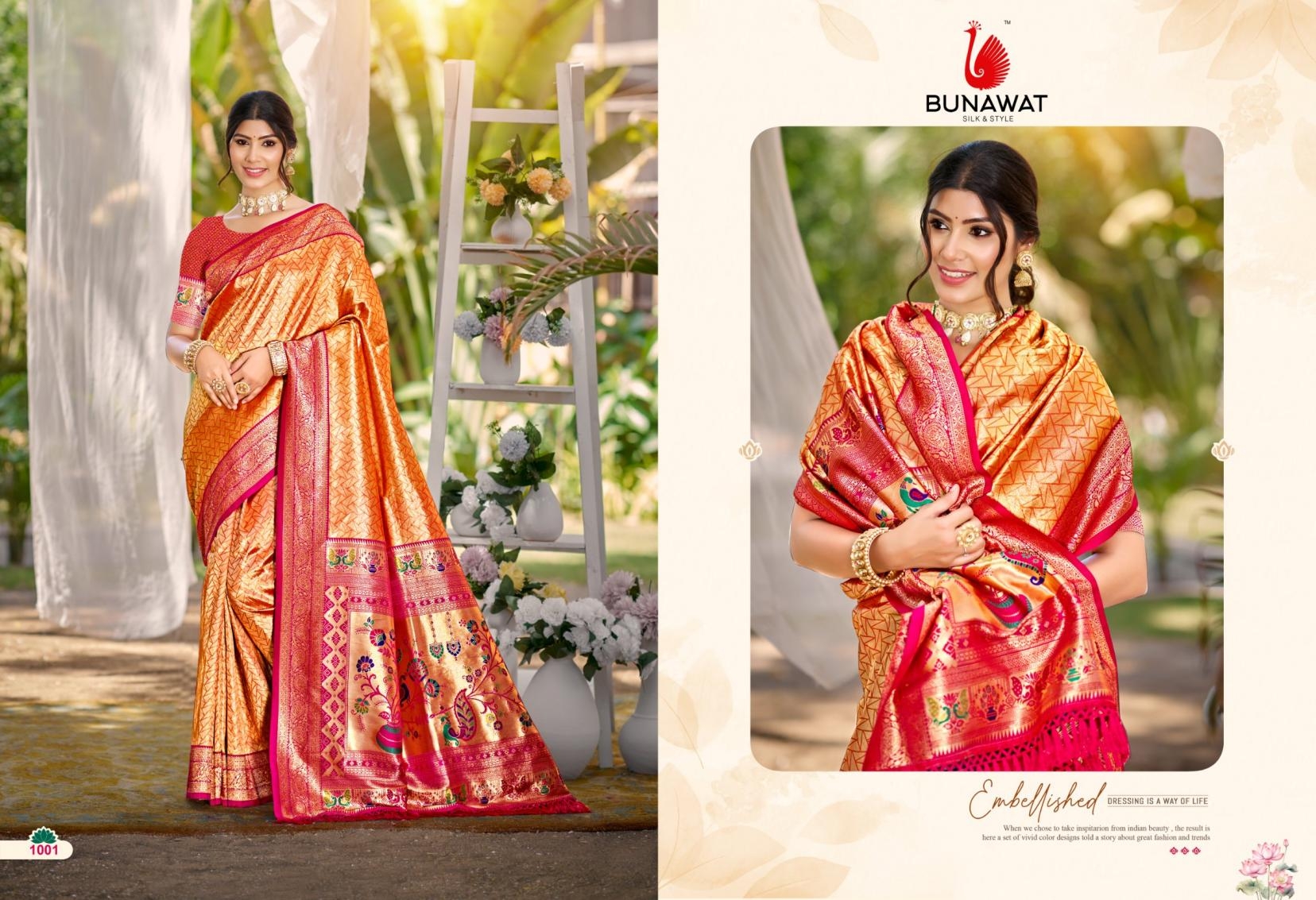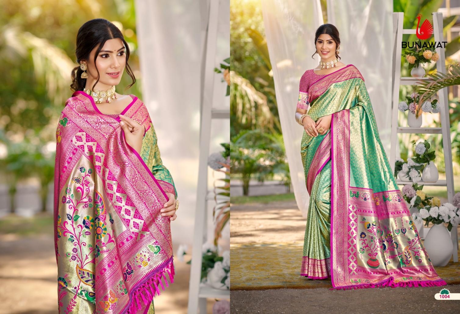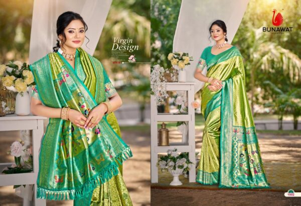 buy Bunawat Devyani SIlk-03 series 1001 to 1006 Sangam Prints Kanjivaram Silk Woven Work Traditional Saree in wholeslae surat latest catalogue 2025