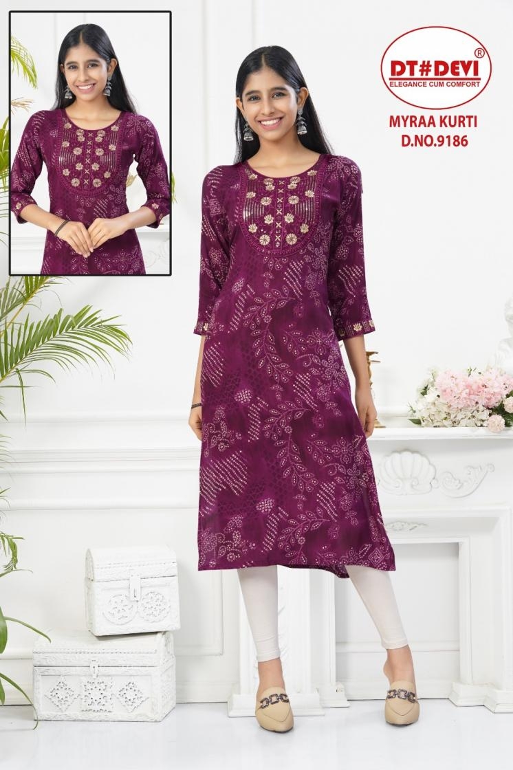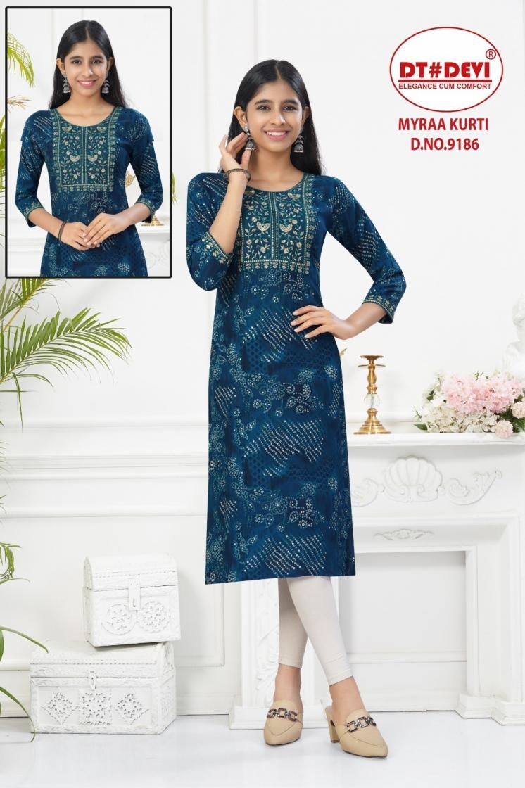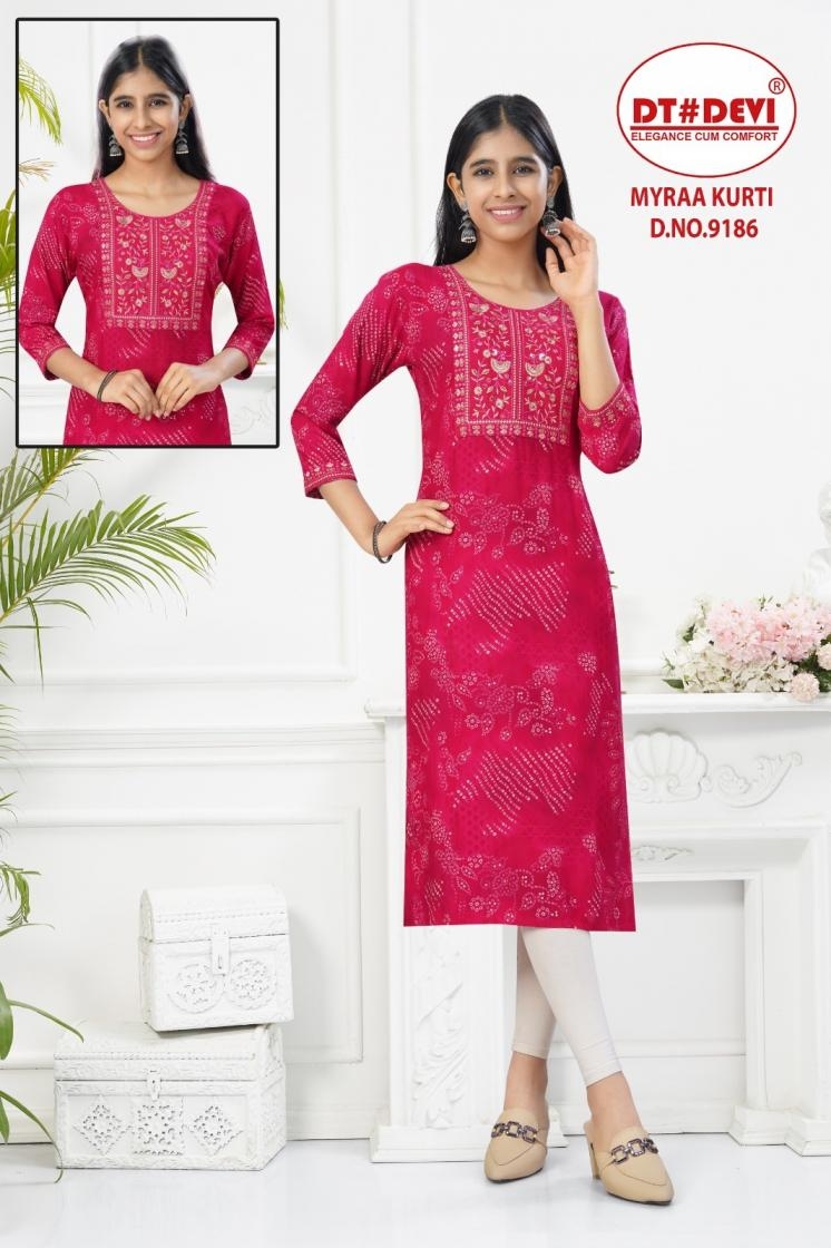 | Name : | Dt Devi Myraa 9186 Rayon Readymade Combo Set Stylish Kids Kurti In Wholesale Surat | |