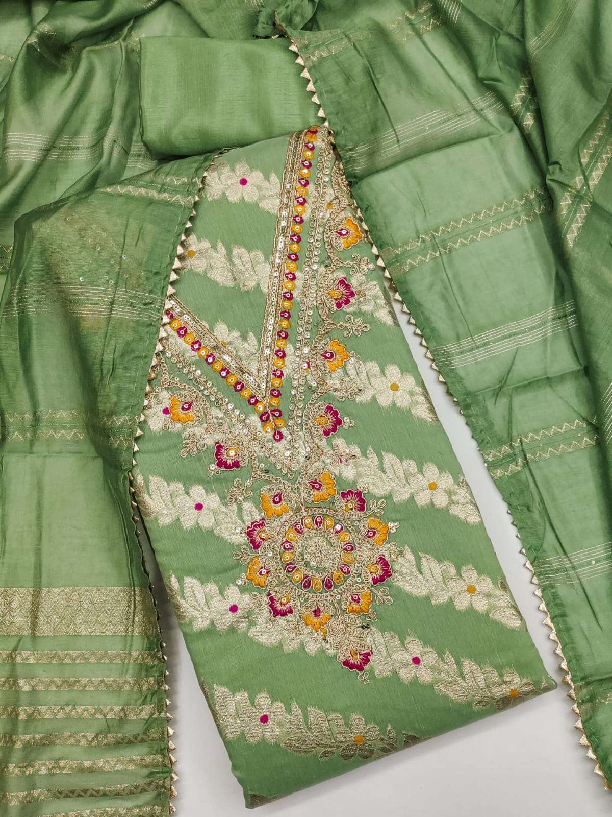 CATLOG NANE Top Fabrics:- MEENAKARI ZAKARD KODDING SQUANCE WORK BOTTOM + INNER Fabrics:- Dupatta: CHANDERI ZAKARD ▪ Size: MATERIALS