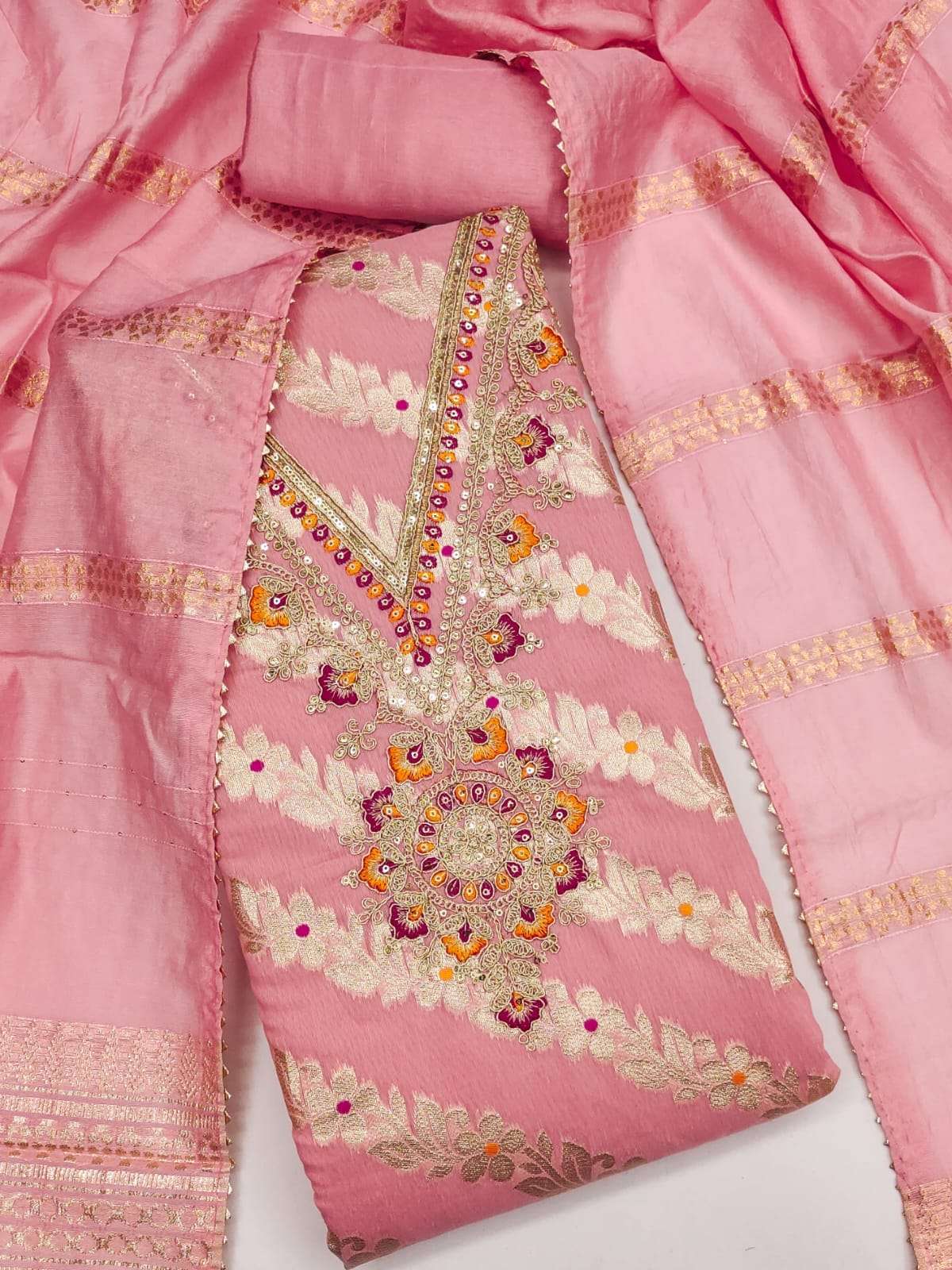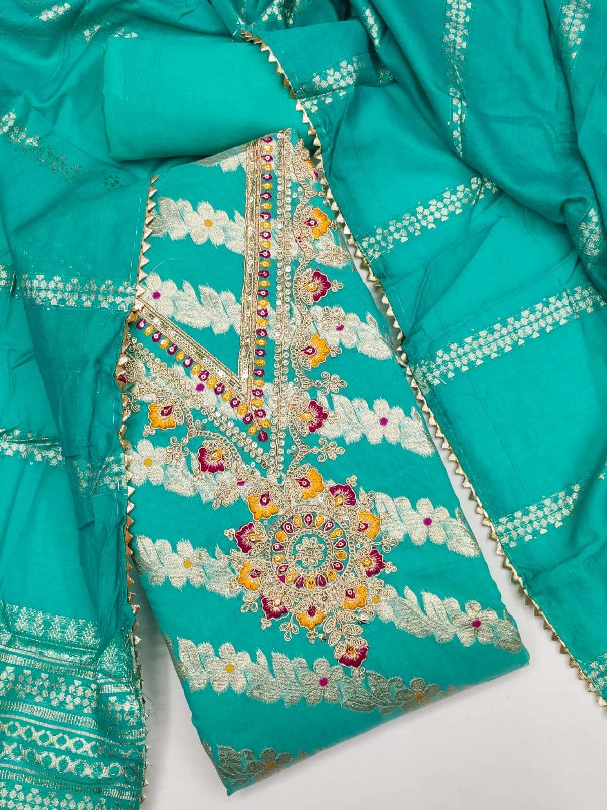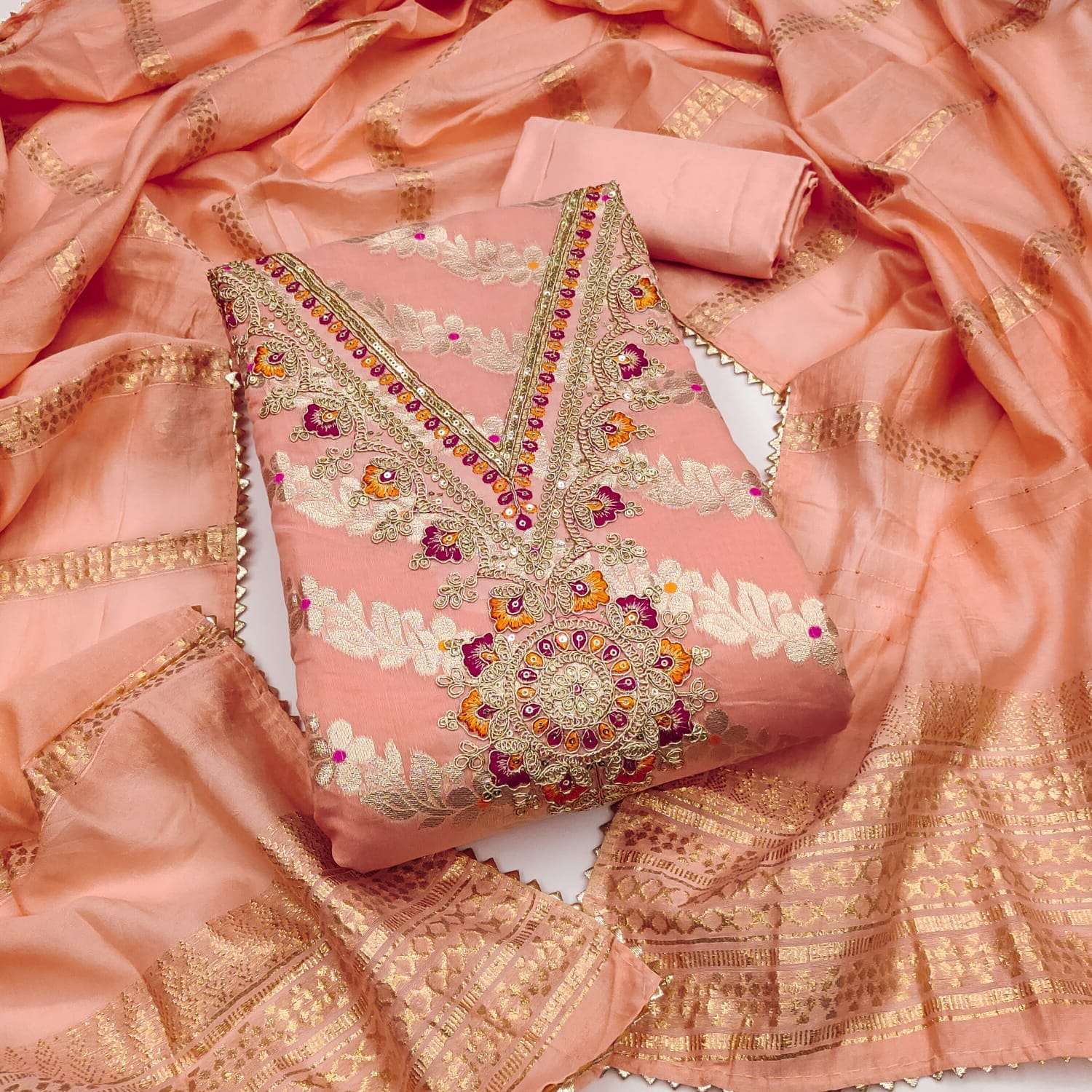 We have dress materials for women and boutique owners who love custom tailoring, which are a perfect choice. You can Explore beautiful printed, embroidered, and designer unstitched suits that can be stitched to your size and style. Our dress materials come with fabric for top, bottom, and dupatta which can is perfect for gifting Purpose.