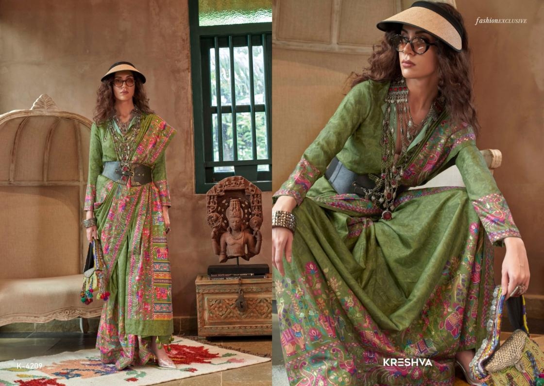 krehsva atarangi series 4209 To 4217 silk exclusive designer sarees in wholesale surat Buy New Latest Catalogue 2025 krehsva atarangi series 4209 To 4217 silk exclusive designer sarees in wholesale surat. Available in Singles and Bulk at Laiq Boutique. Buy at Wholesale price at very reasonable rate. Specification :
