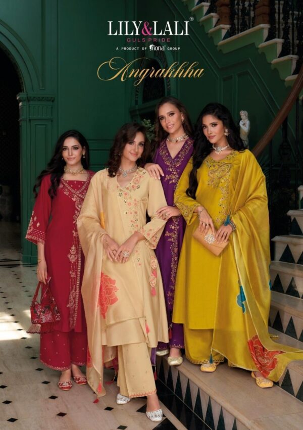 buy lily & lali angrakhha series 26801 to 26804 exclusive roman silk readymade plazzo style suit in wholesale surat latest catalogue 2025