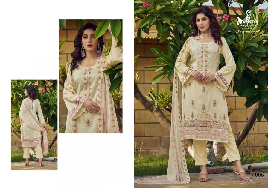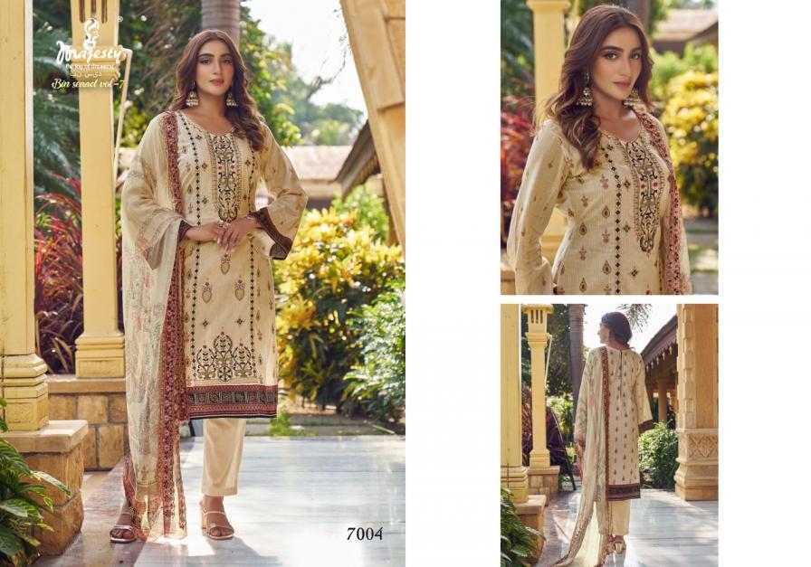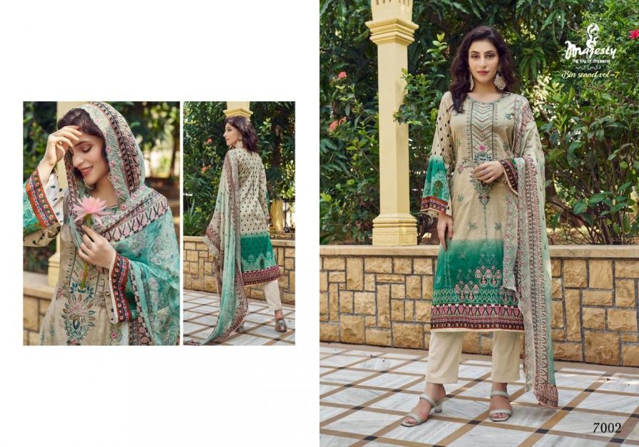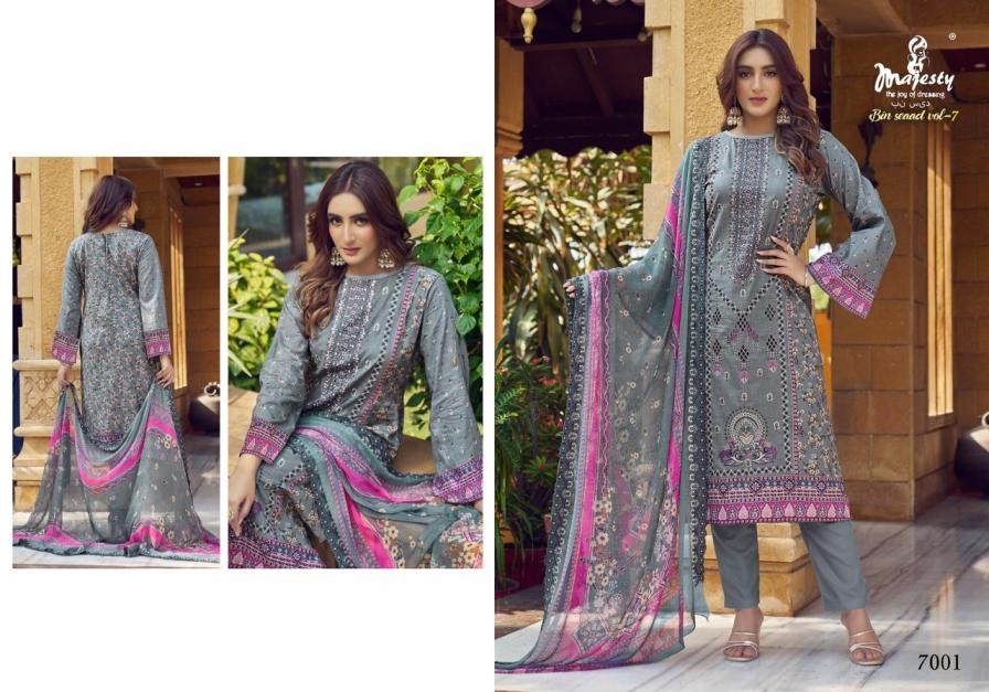 majesty bin saeed vol 7 series 7001-7006 cotton wholesale suit Buy New Latest Catalogue 2025 majesty bin saeed vol 7 series 7001-7006 cotton wholesale suit . Available in Singles and Bulk at Laiq Boutique. Buy at Wholesale price at very reasonable rate. Specification :