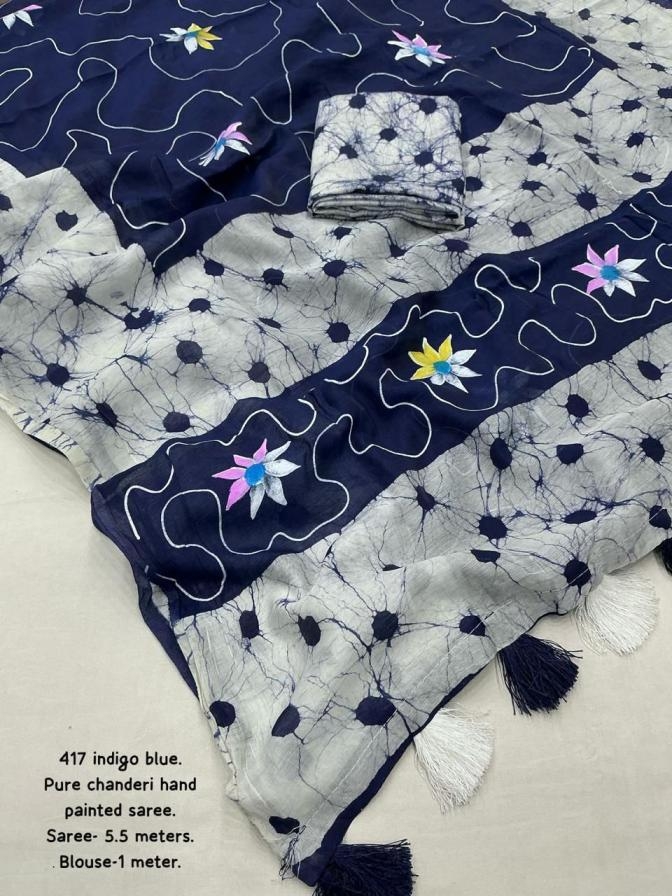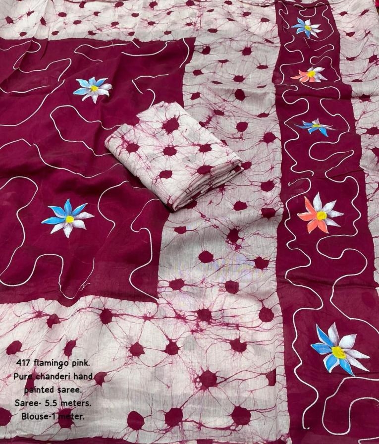 new arrivals New hand painted saree KC – 417 magic paint. Pure Chanderi cotton saree with beautifull combinations of batik prints and hand paints. Cotton tassles on pallu. Blouse- pure chanderi crack batik blouse. Rate – 1350+ship Top premium quality |