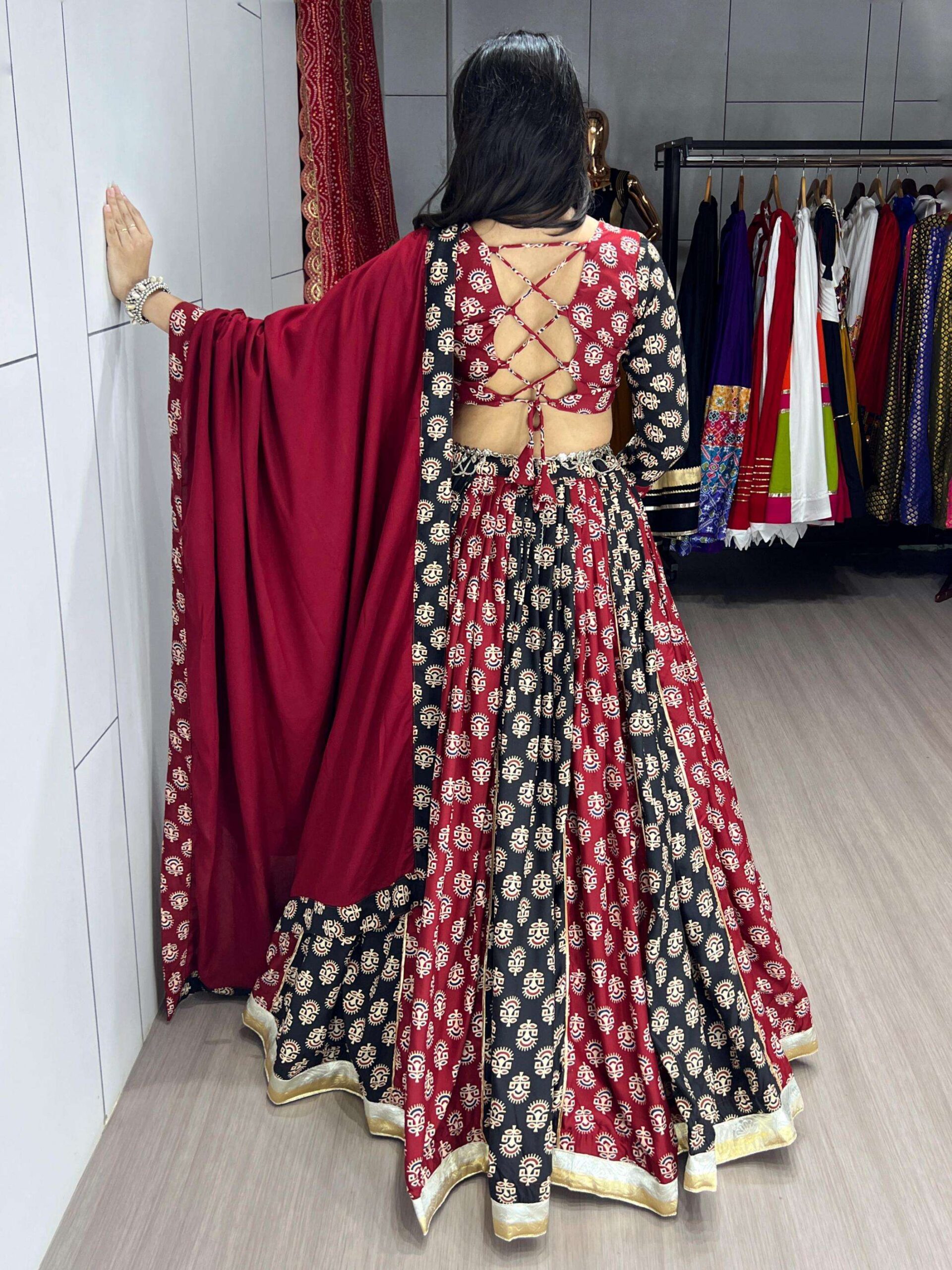 This Black and Maroon lehenga showcases timeless Ethnicity With Ajarakh Prints,Designed for dance devotion or Weddings,Let your Traditional look glow with this Two-toned lehenga with Azarakh Motifs.✨🌸