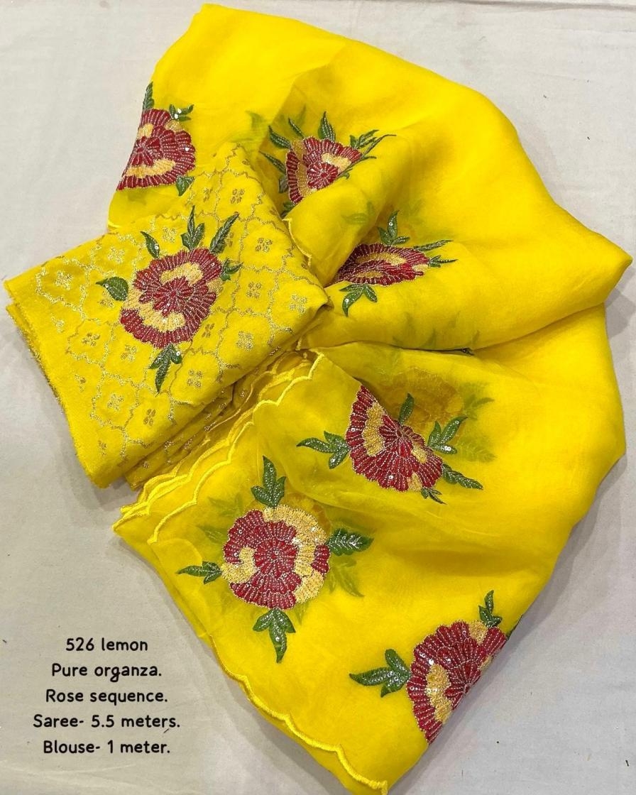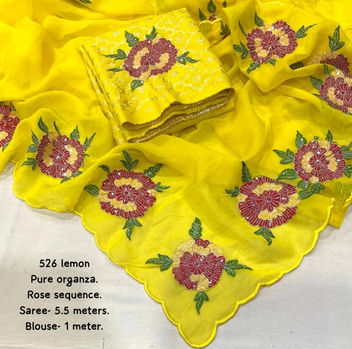 new arrivals New premium organza saree kc – 526 organa rose. Soft pure organza saree in lemon color. Heavy rose sequence emboridary. Cutwork on border. Perfectly matched banarasi silk blouse with emboridary. Rate – 1750+ship Top trusted quality |