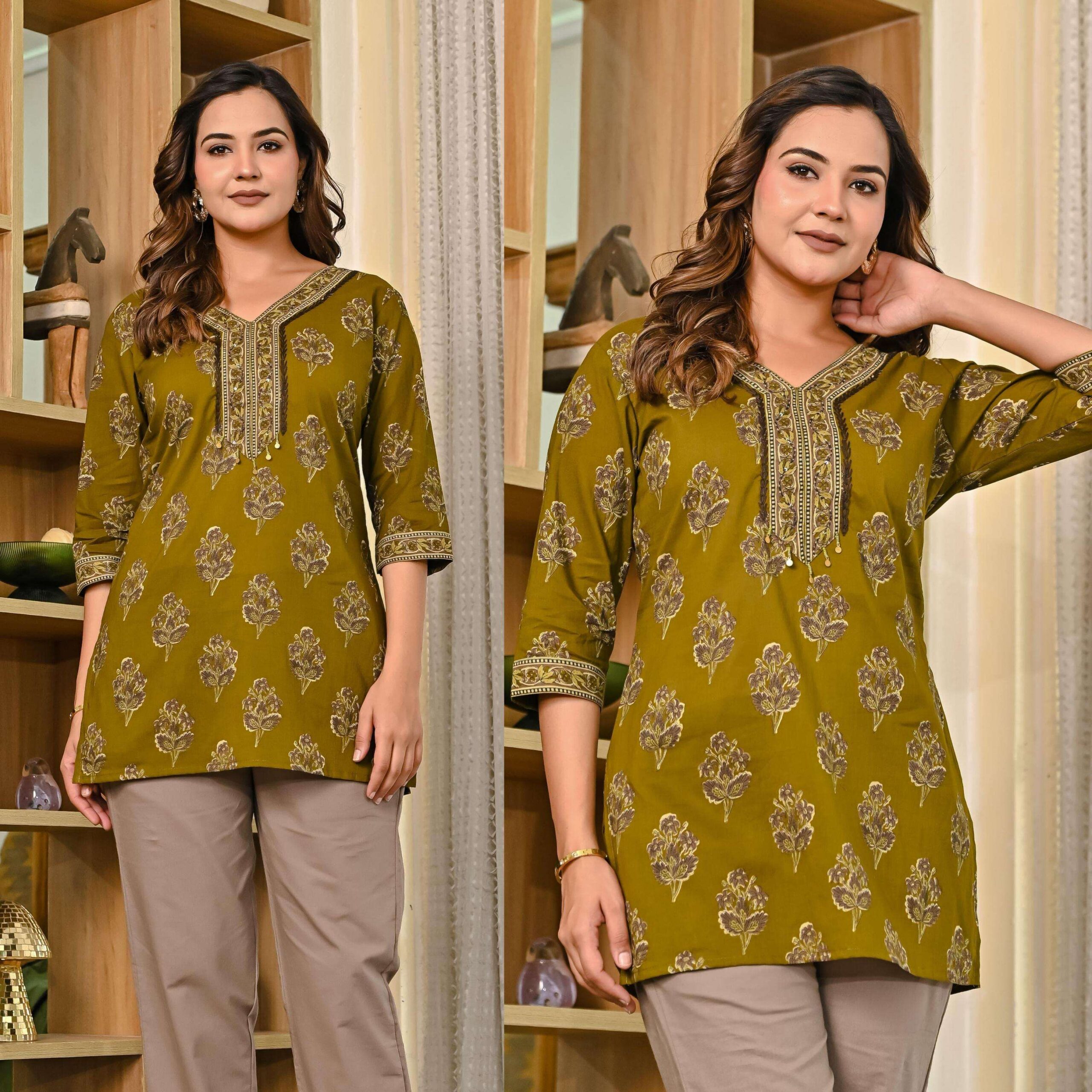 You can Shop our premium Indian Kurtis in fabric like cotton, rayon, silk, muslin, georgette, and designer fabrics. We have stock of casual printed Kurtis for everyday comfort, elegant office wear kurtas, and partywear Kurtis with handwork, mirror work, and embroidery work. Sizes are available for small size to plus size women.