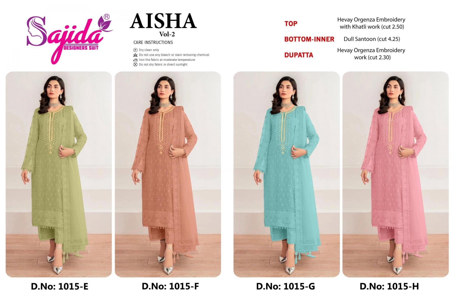 | Name : | Sajida Designer Aisha Vol 2 Series 1015 E To 1015 H Organza Designer Pakistani Suits In Wholesale Surat | |