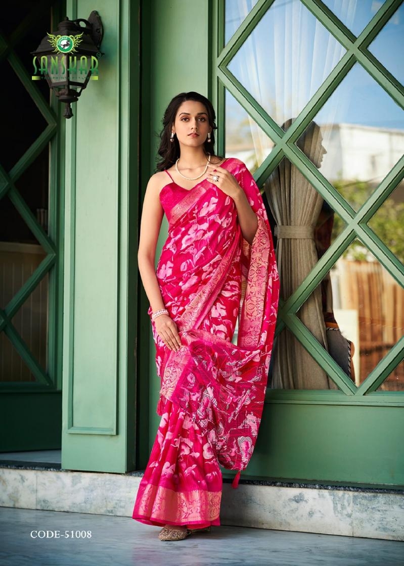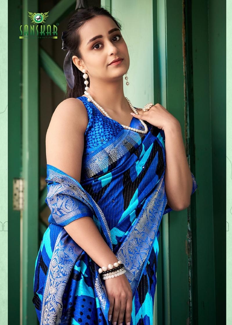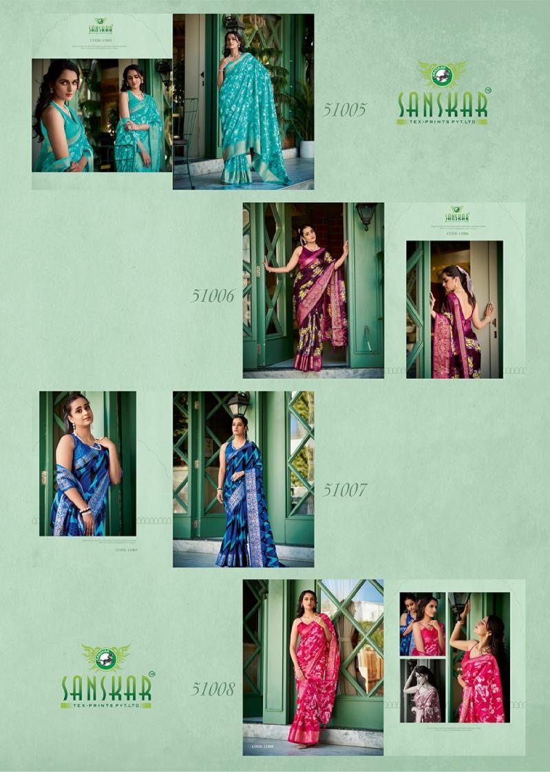 | Name : | Sanskar Tex Aanu Series 51001 To 51008 Prints Hit Design Dola Jari Lining Sarees In Wholesale Surat | |