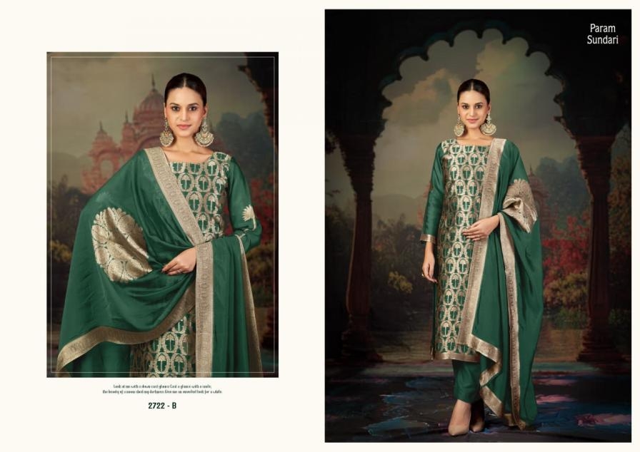 sargam prints sundari series 2722A to 2722D amazing banglory silk jacquard salwar kameez in wholesale surat Buy New Latest Catalogue 2025 sargam prints sundari series 2722A to 2722D amazing banglory silk jacquard salwar kameez in wholesale surat. Available in Singles and Bulk at Laiq Boutique. Buy at Wholesale price at very reasonable rate. Specification :