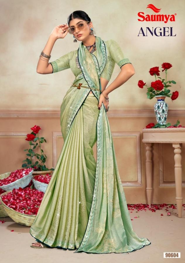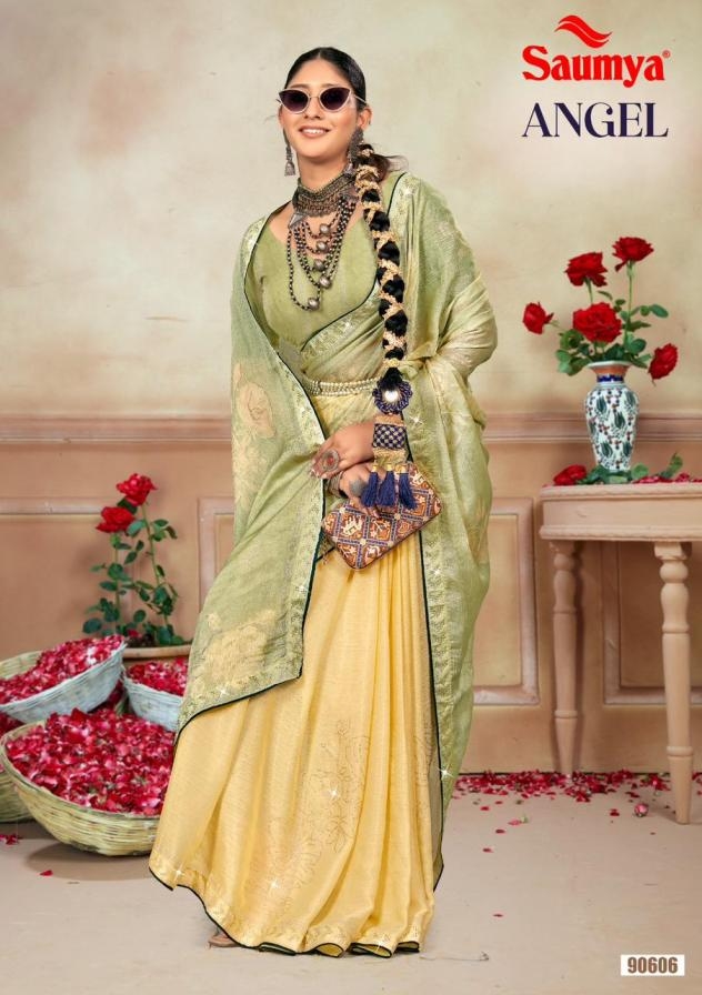 saumya angel series 90603 to 90608 chiffon brasso gorgeous look saree in wholesale surat