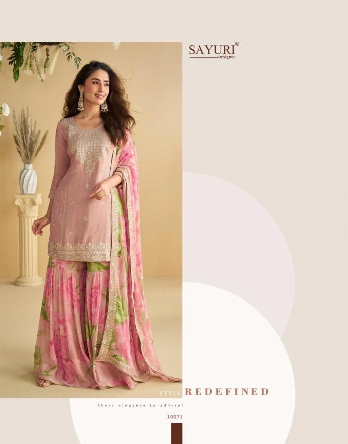 | Name : | Sayuri Designer Gulabo Series 10069 To 10073 Readymade Festival Wear Chinon Silk Plazzo Suits In Wholesale Surat | |
