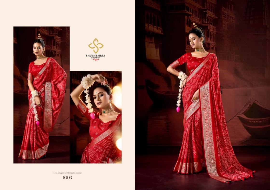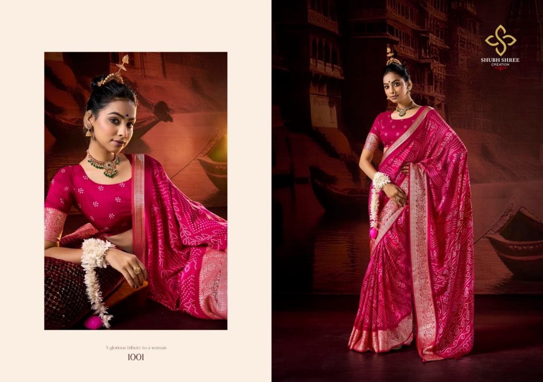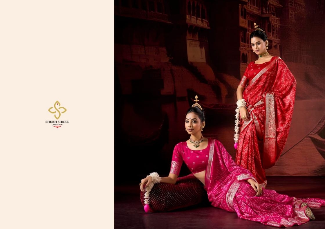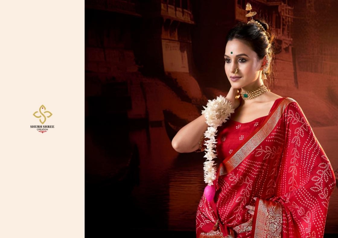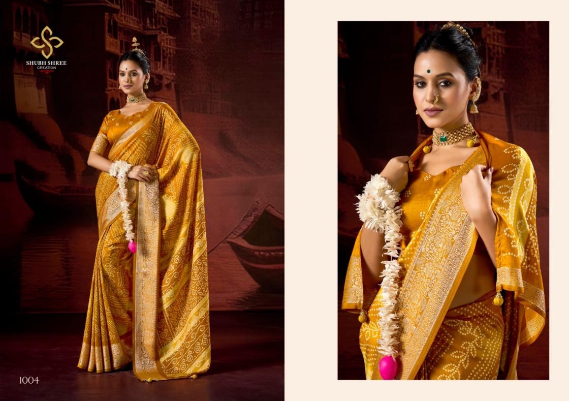 SHUBH SHREE CREATION 🌻 KAASHI – 1🌻 RATE – ₹ 875/- FABRIC = LATEST BANDHEJ IN VELVET TUSSER SILK WITH WEAVING VISCOS JACQUARD BORDER Set – 4 pc |