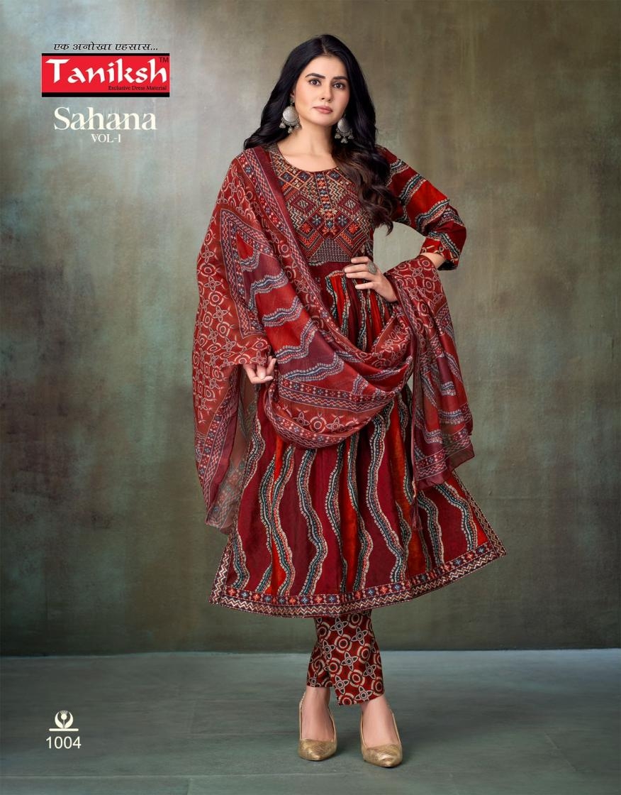 buy taniksh sahana vol 1series 1001 to 1006 muslin print readymade suit in wholesale surat latest catalogue 2025