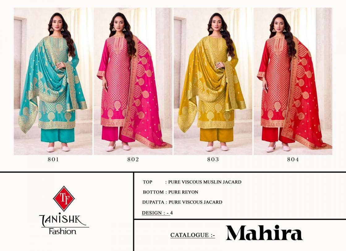 buy tanishk fashion mahira series 801 to 804 muslin jacquard salwar kameez in wholesale surat latest catalogue 2025