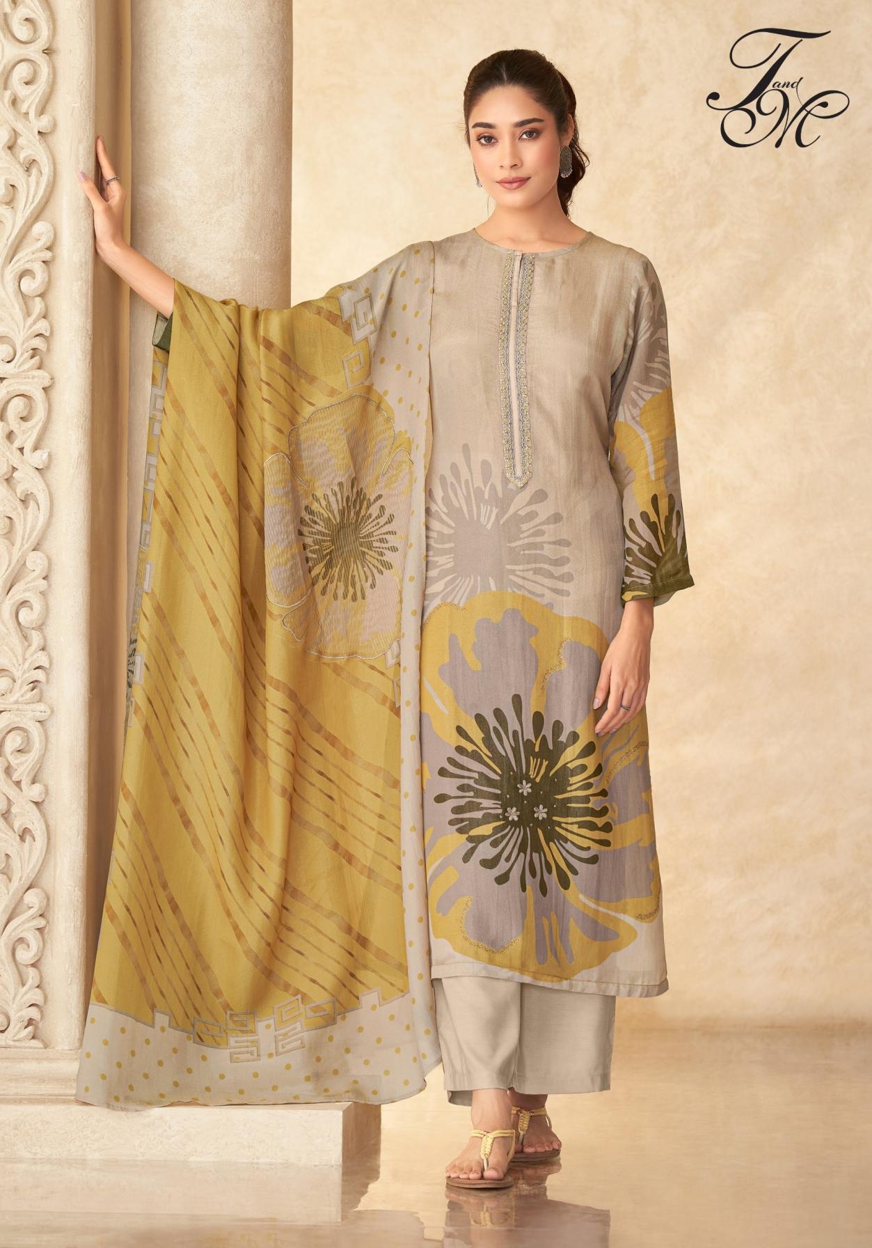 t&m sahiba laveena series 3695 to 3646 tissue jari print regular wear unstitched dress material
