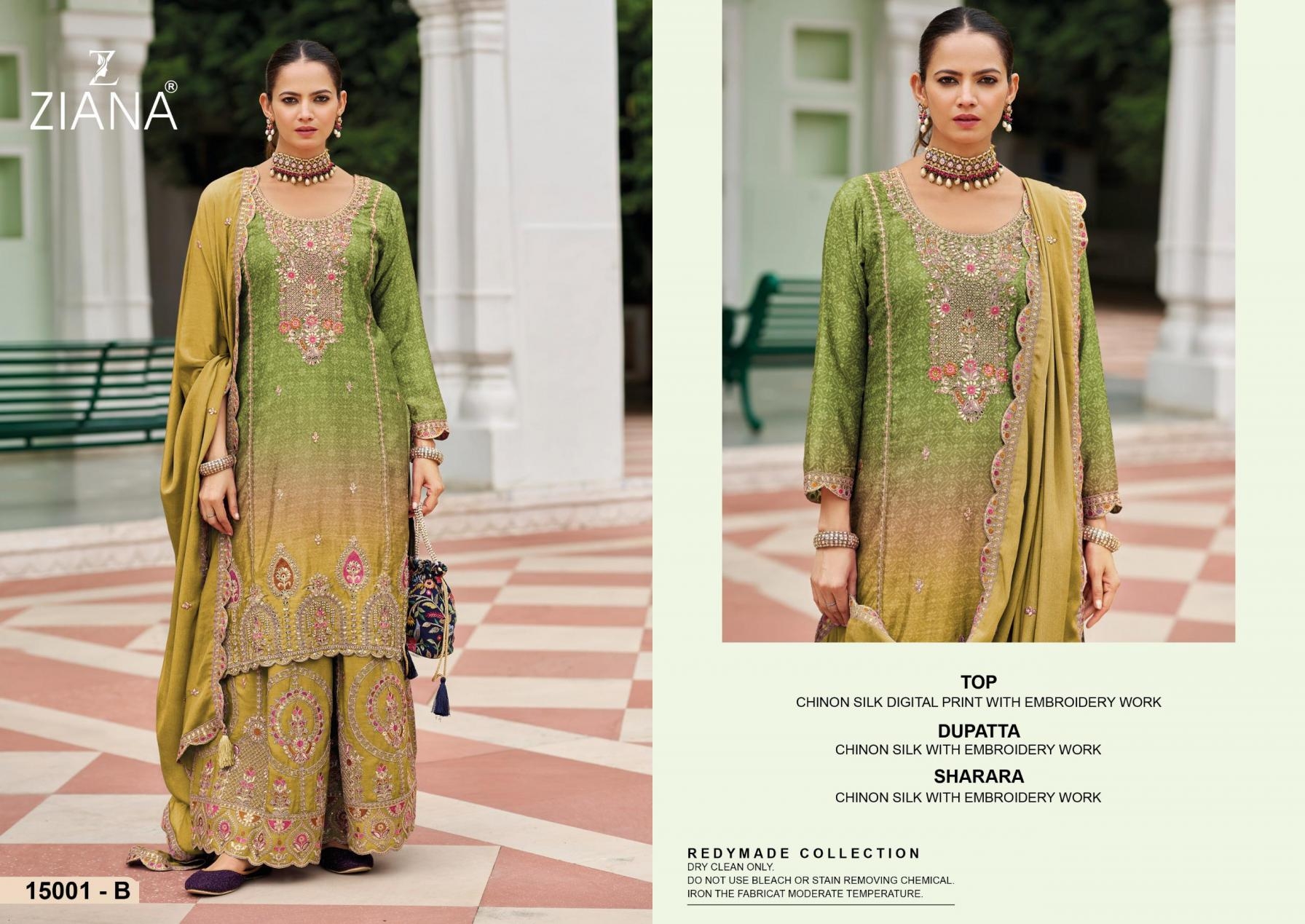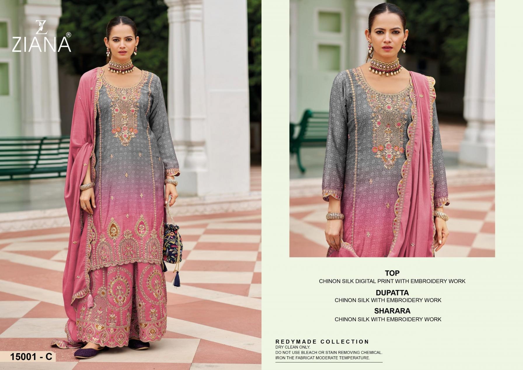 buy ziana 15001 A to D chinon silk readymade party wear sharara style suit in wholesale surat latest catalogue 2025